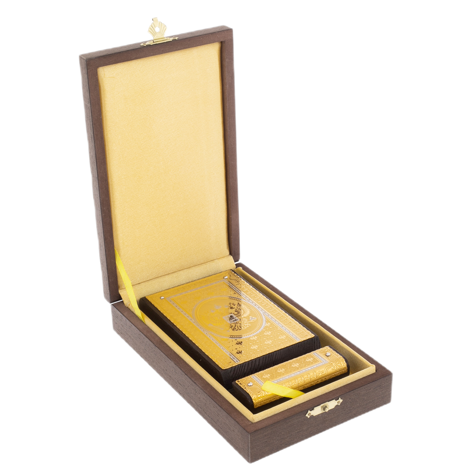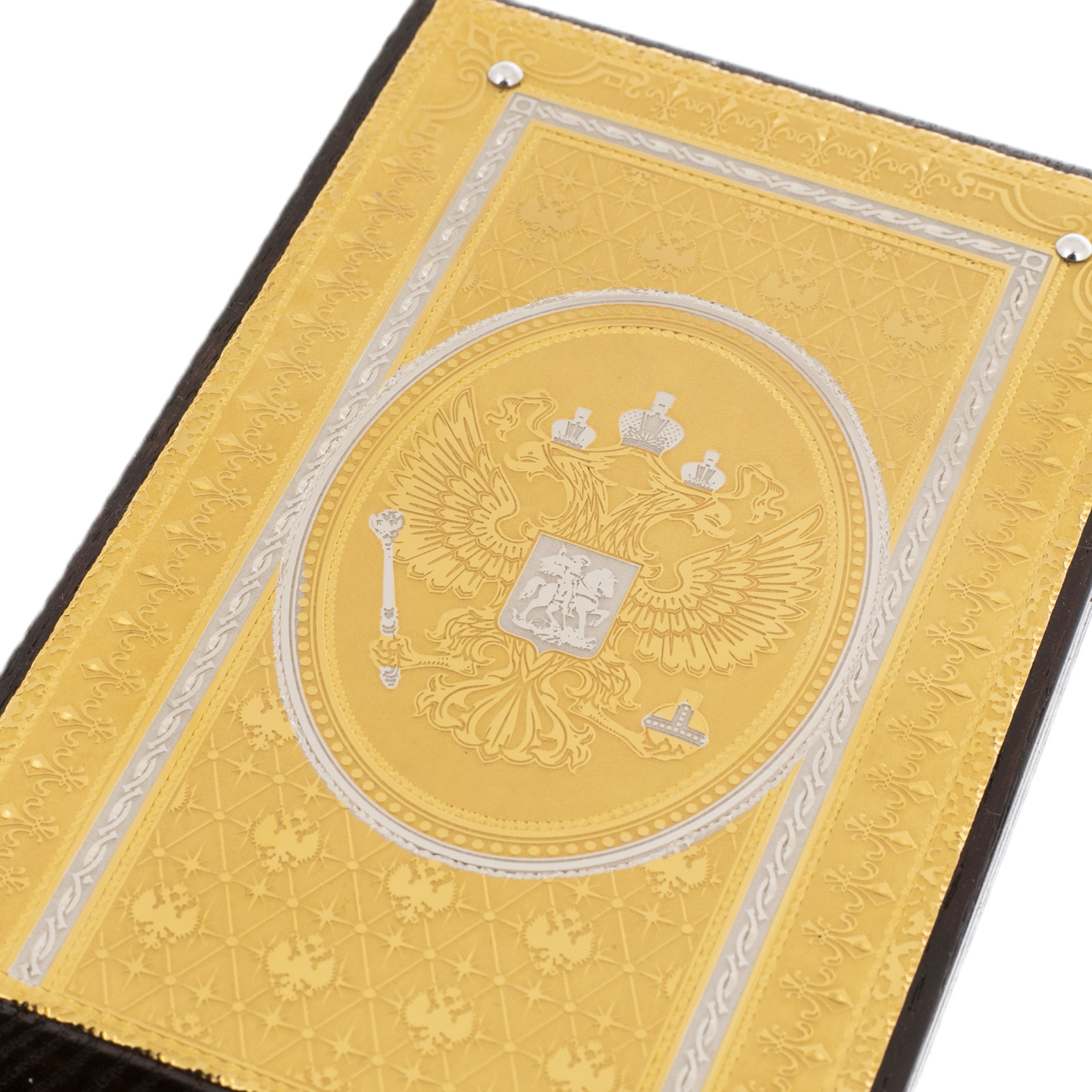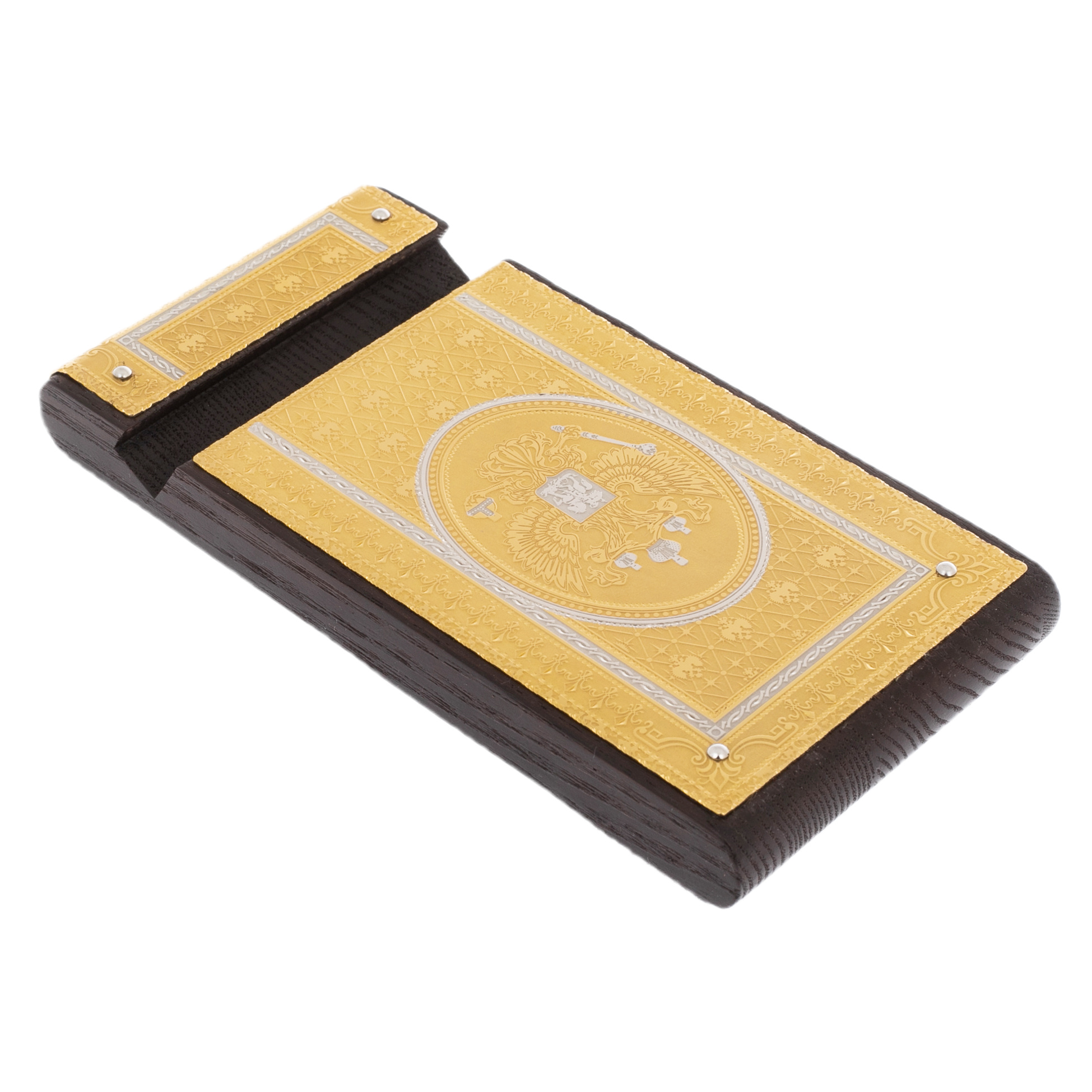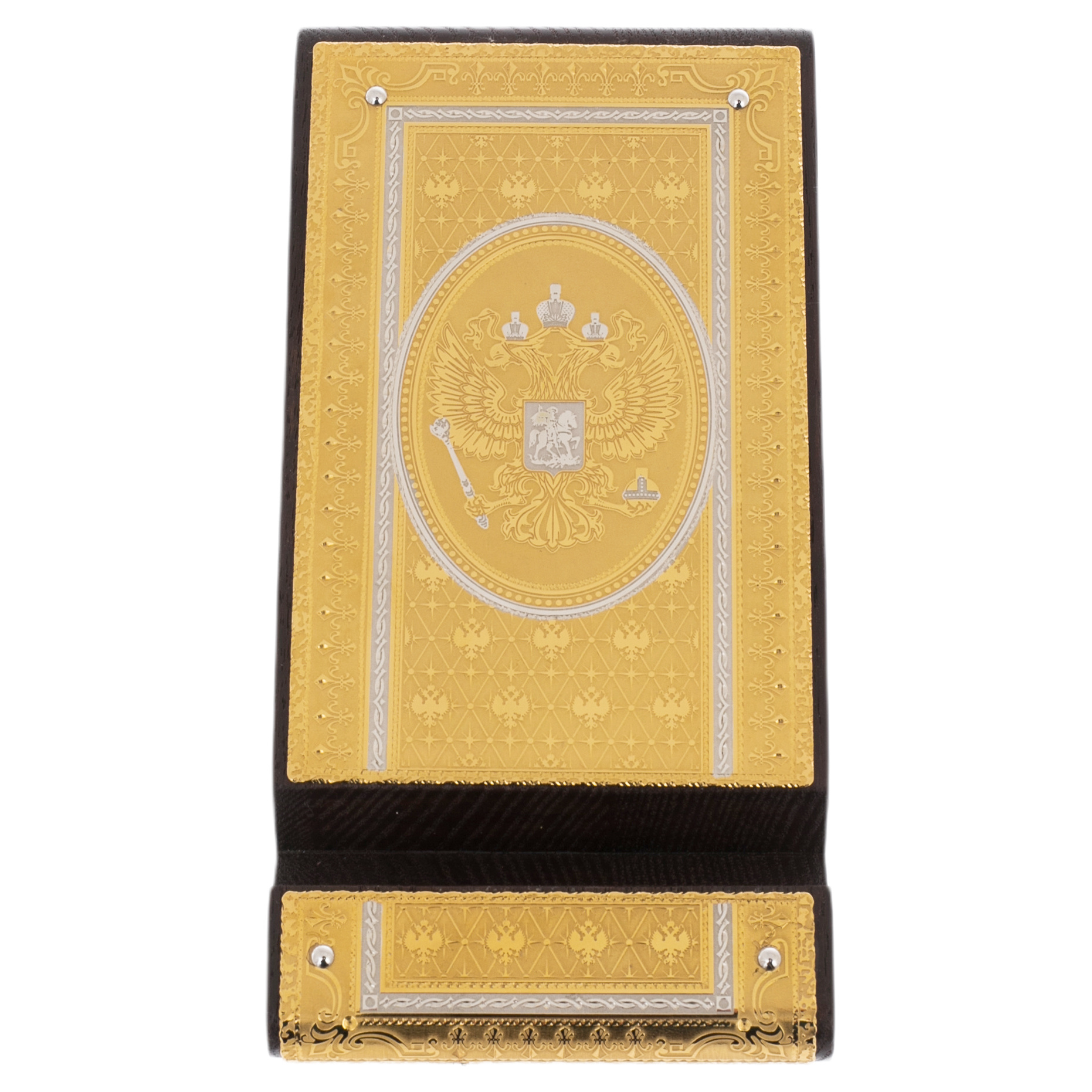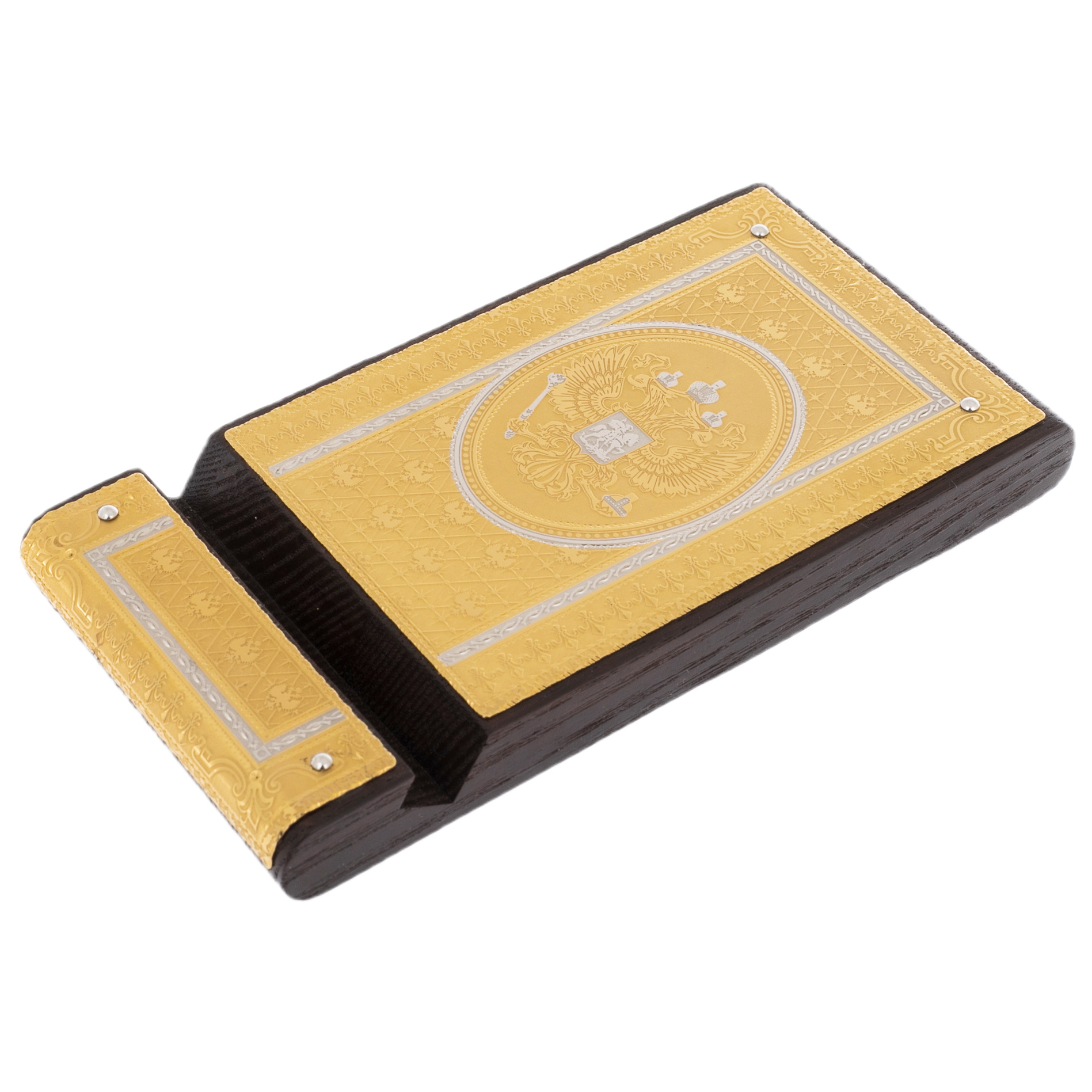 На переднюю панель массивной подставки нанесён двуглавый орёл, проработанный до мельчайших линий с филигранной точностью. Композиция заключена в овальный картуш, обрамлённый орнаментальными рамками, выведенными вручную на фоне из матированного золота. Использована златоустовская техника: гравировка, золочение, чернение серебром и полировка. Благодаря этому изображение обладает объёмом, глубиной и блеском, меняющимся в зависимости от угла освещения. Тонированная в цвет венге деревянная основа придаёт изделию устойчивость и завершённость.