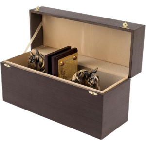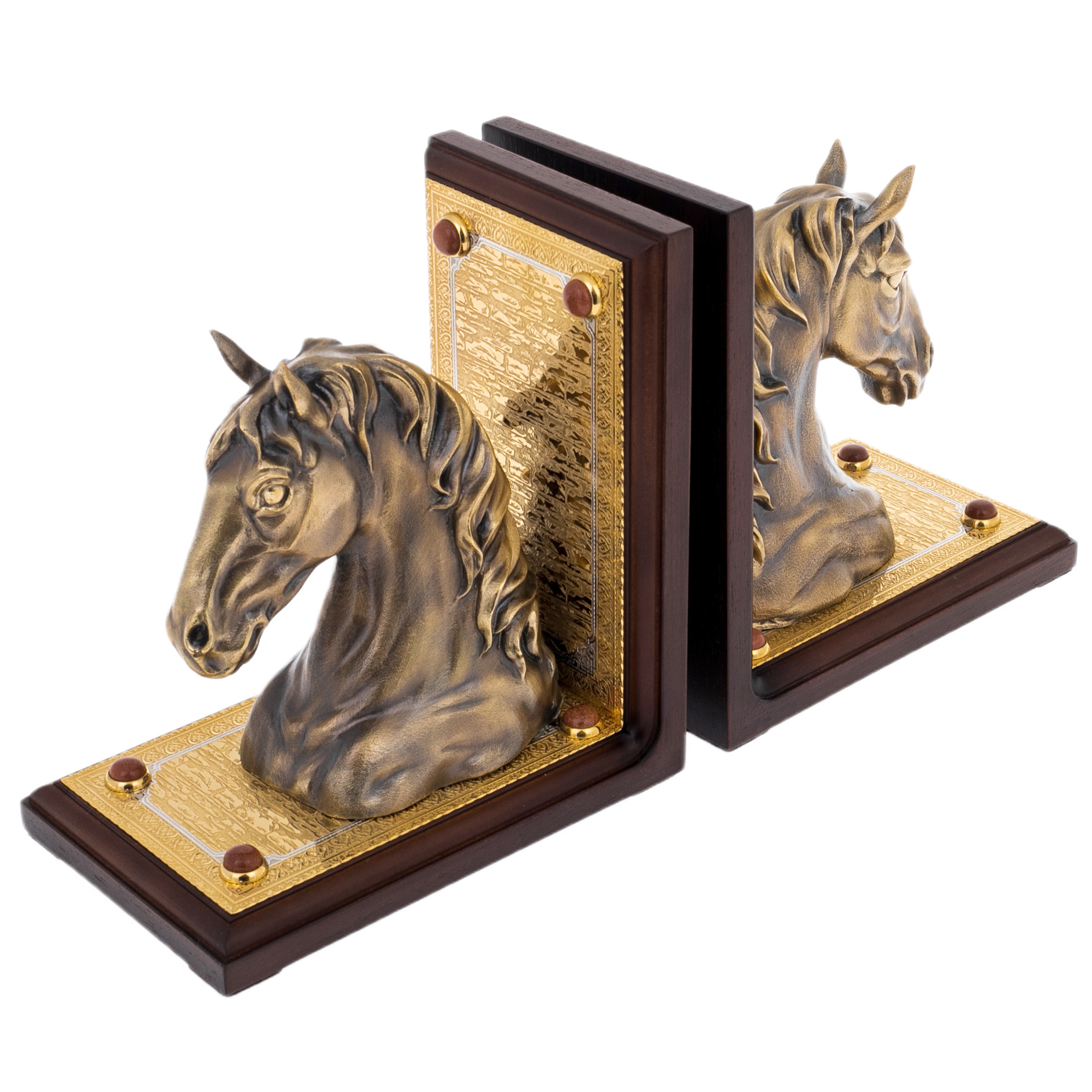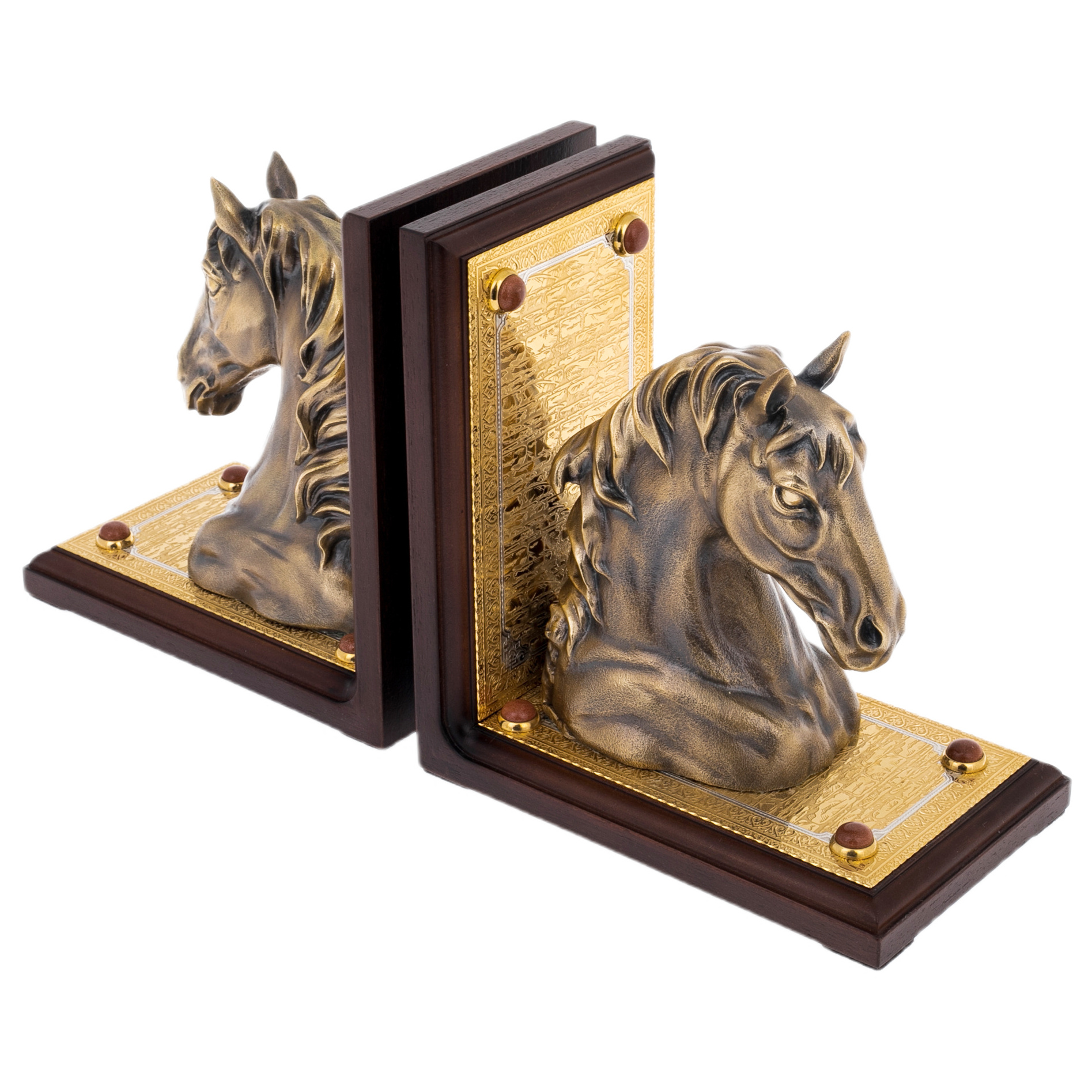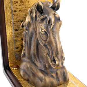Подставки с образами благородных коней представляют собой изысканный предмет интерьера, созданный мастерами Златоуста для ценителей художественного металла и утончённой символики. Каждая основа выполнена из тёмного дерева глубокого тона, подчёркивающего сияние золочёных пластин с тончайшей гравировкой. На этих пластинах размещены полусферы из декоративного камня, придающие композиции завершённость и особую материальность. Центральным акцентом служат массивные скульптурные головы коней, отлитые из металла и покрытые благородной бронзовой патиной. Скульптуры отличаются выразительной проработкой: фактурная грива, мягко сходящая на шею, внимательный взгляд и мощные линии морды создают ощущение силы, мудрости и движения, едва уловимого в статике композиции.