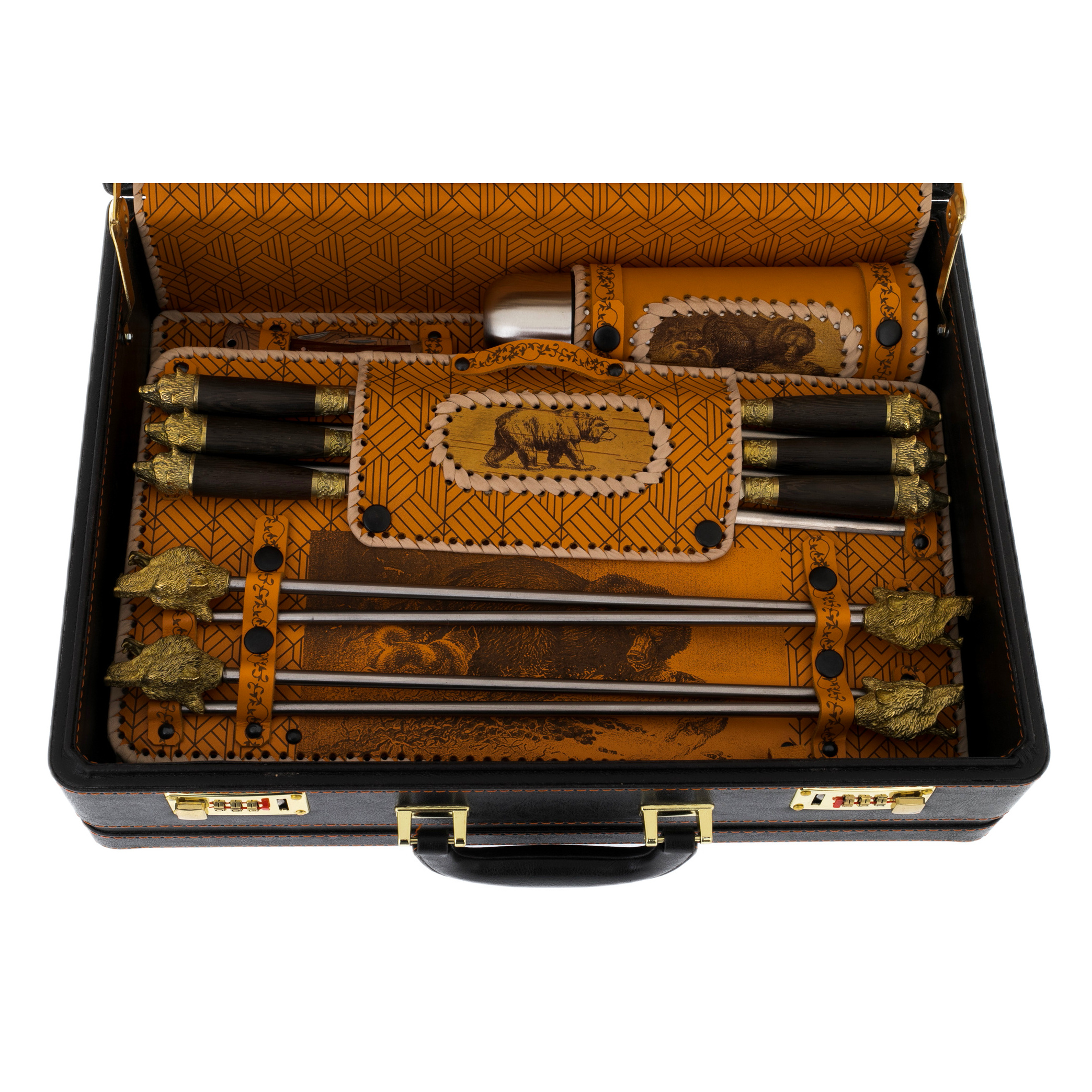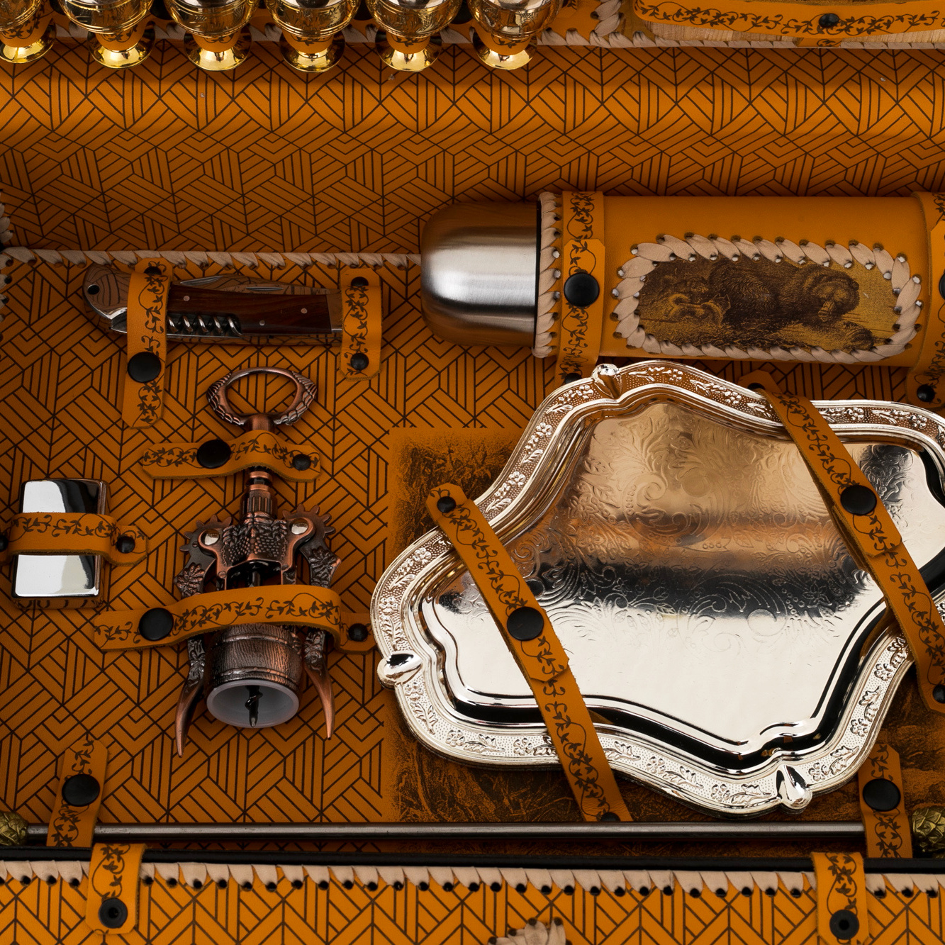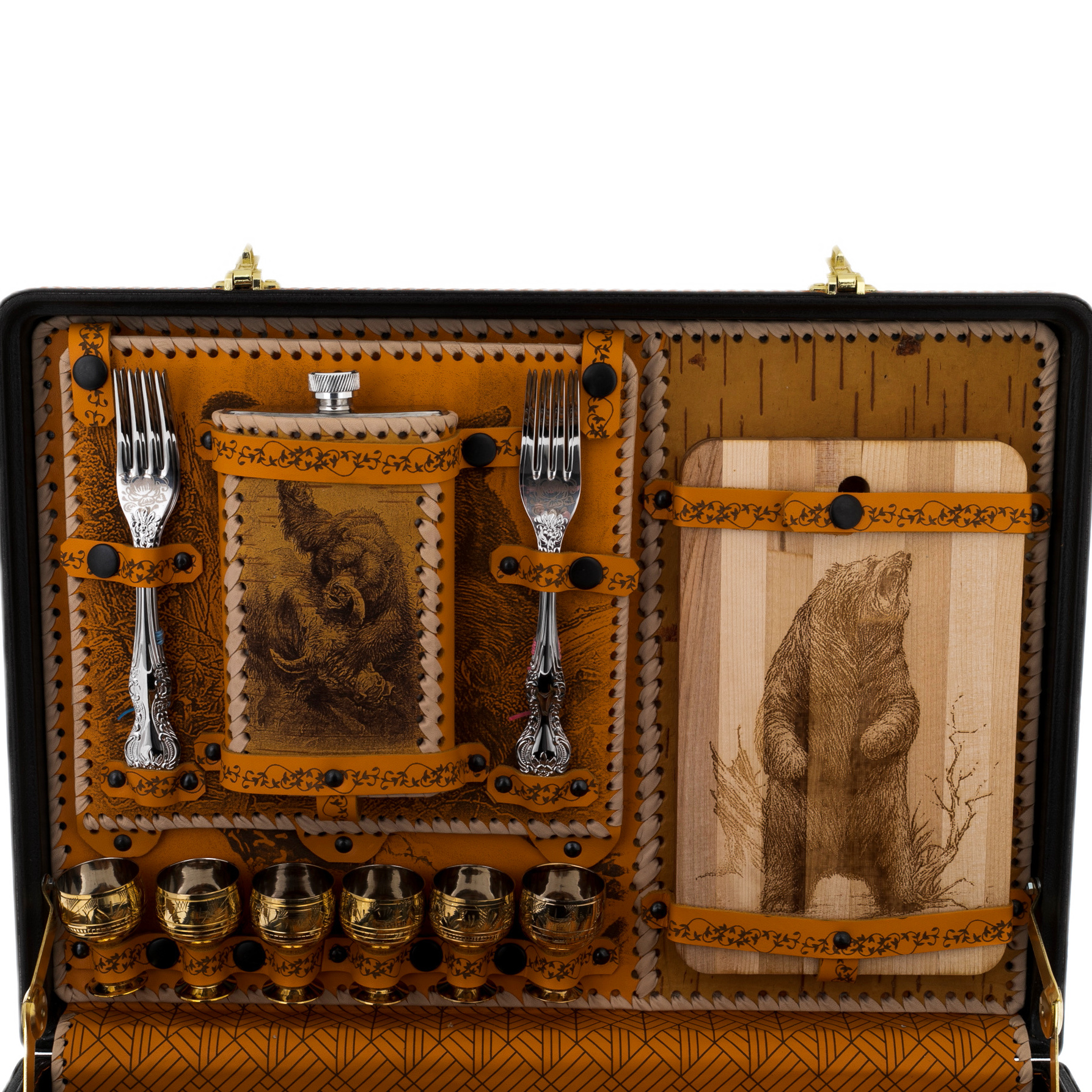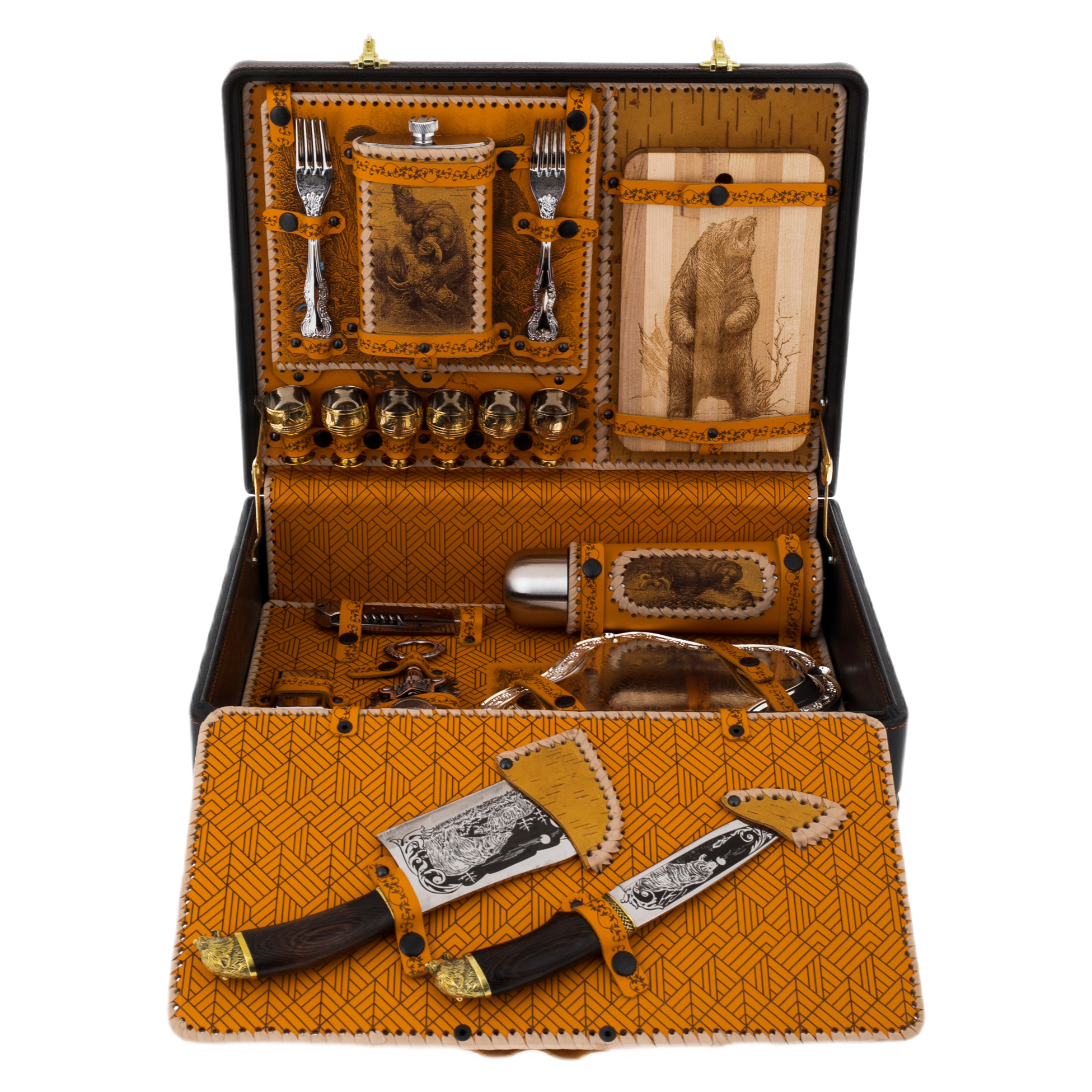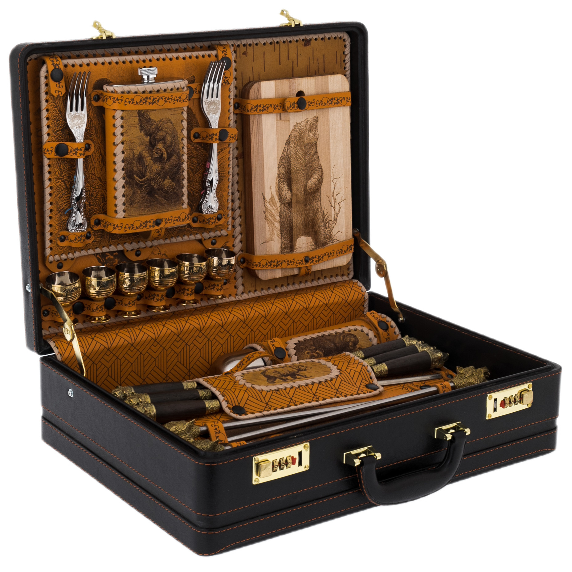 Подарочный набор для пикника – красивый и функциональный сувенир в дизайнерском исполнении для любителей дачных посиделок у костра. В коллекцию входит стальная фляжка, охотничий нож, зажигалка и оловянные стопки. В некоторых наборах есть вилки, ложки и тарелки – с таким набором можно устроить загородное застолье по высшему классу. Роскошный кейс из натуральной кожи украшен ручной росписью, также по желанию клиента можно нанести логотип, поздравительную надпись и красивый рисунок. Набор для пикника превратит любую поездку за город в праздник!