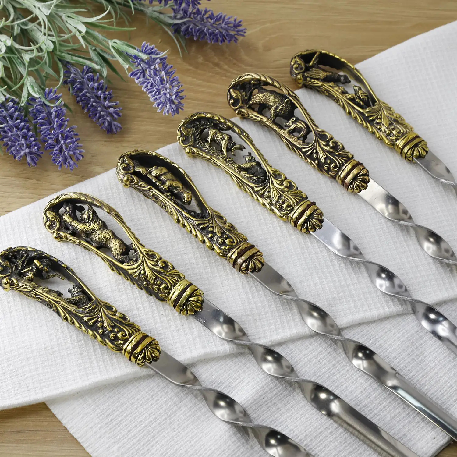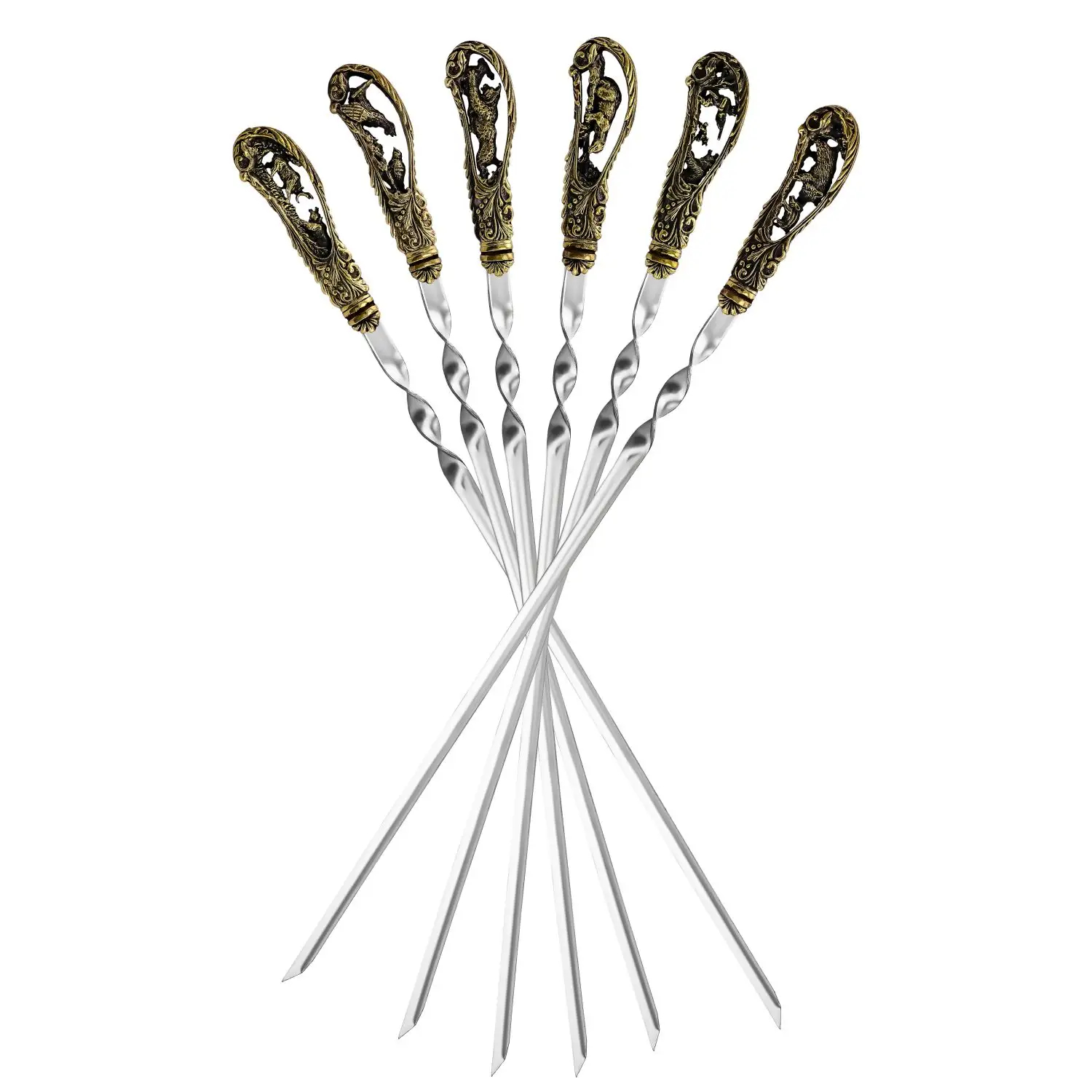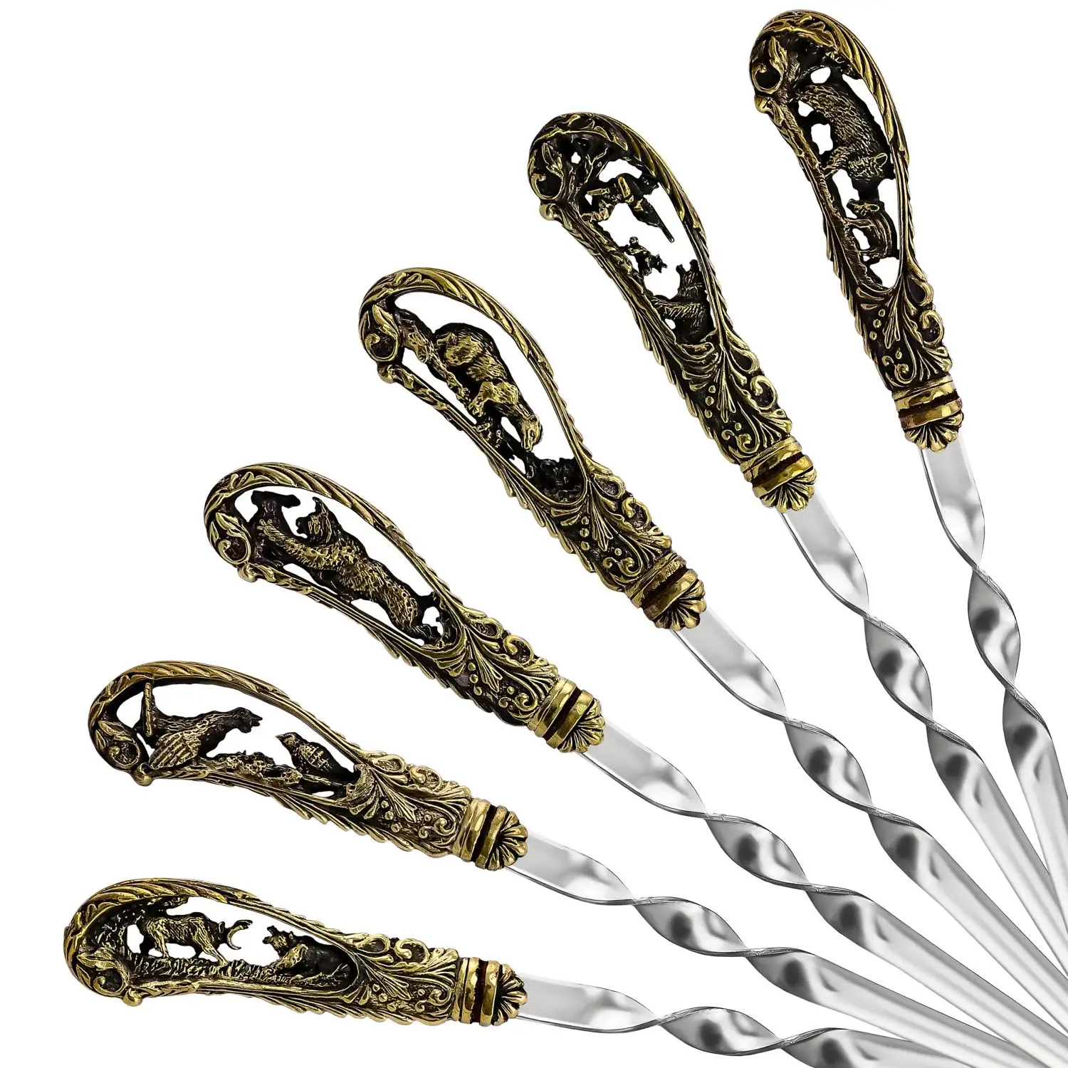 Латунный набор шампуров "Охотничий" с чернением, 6 предметов в коробке