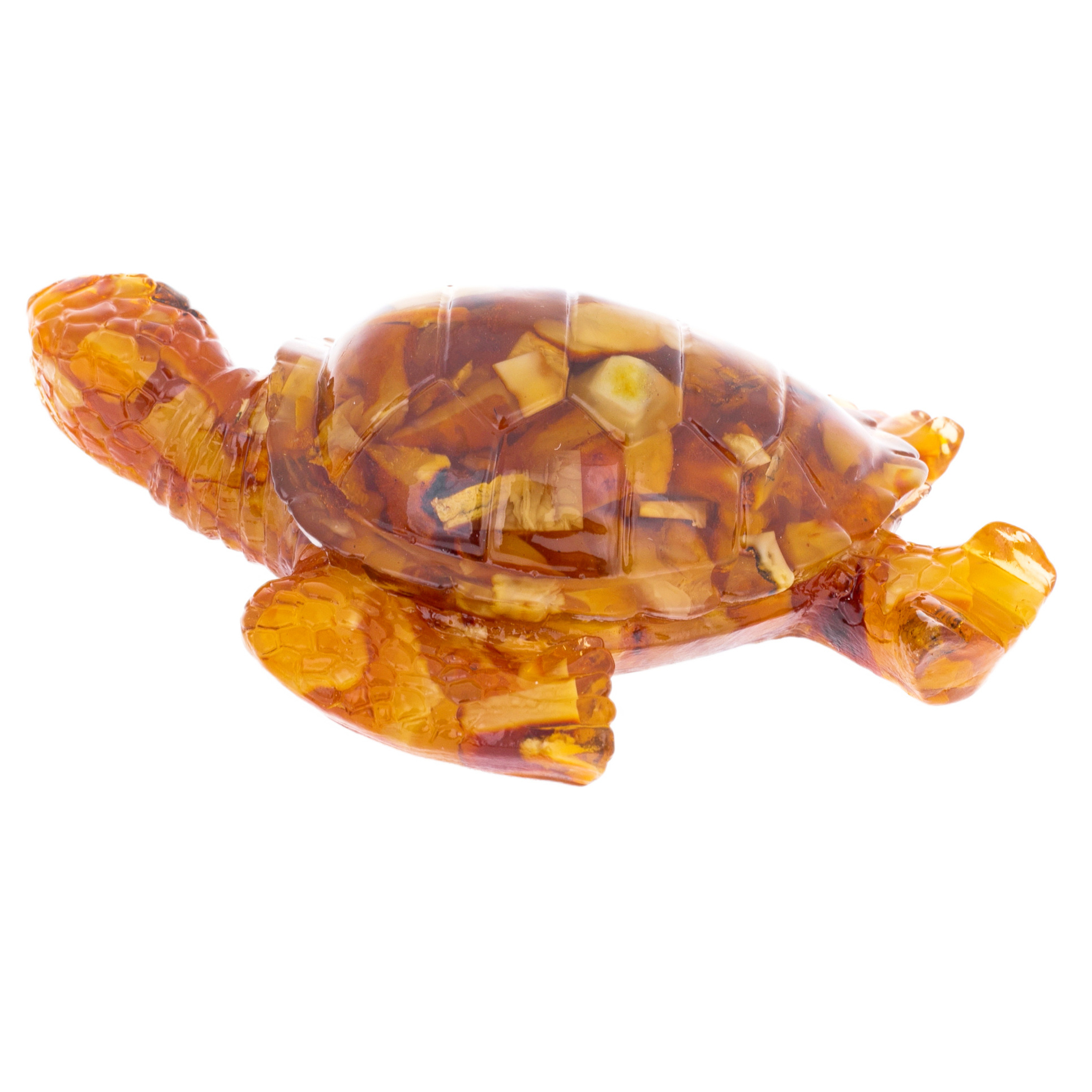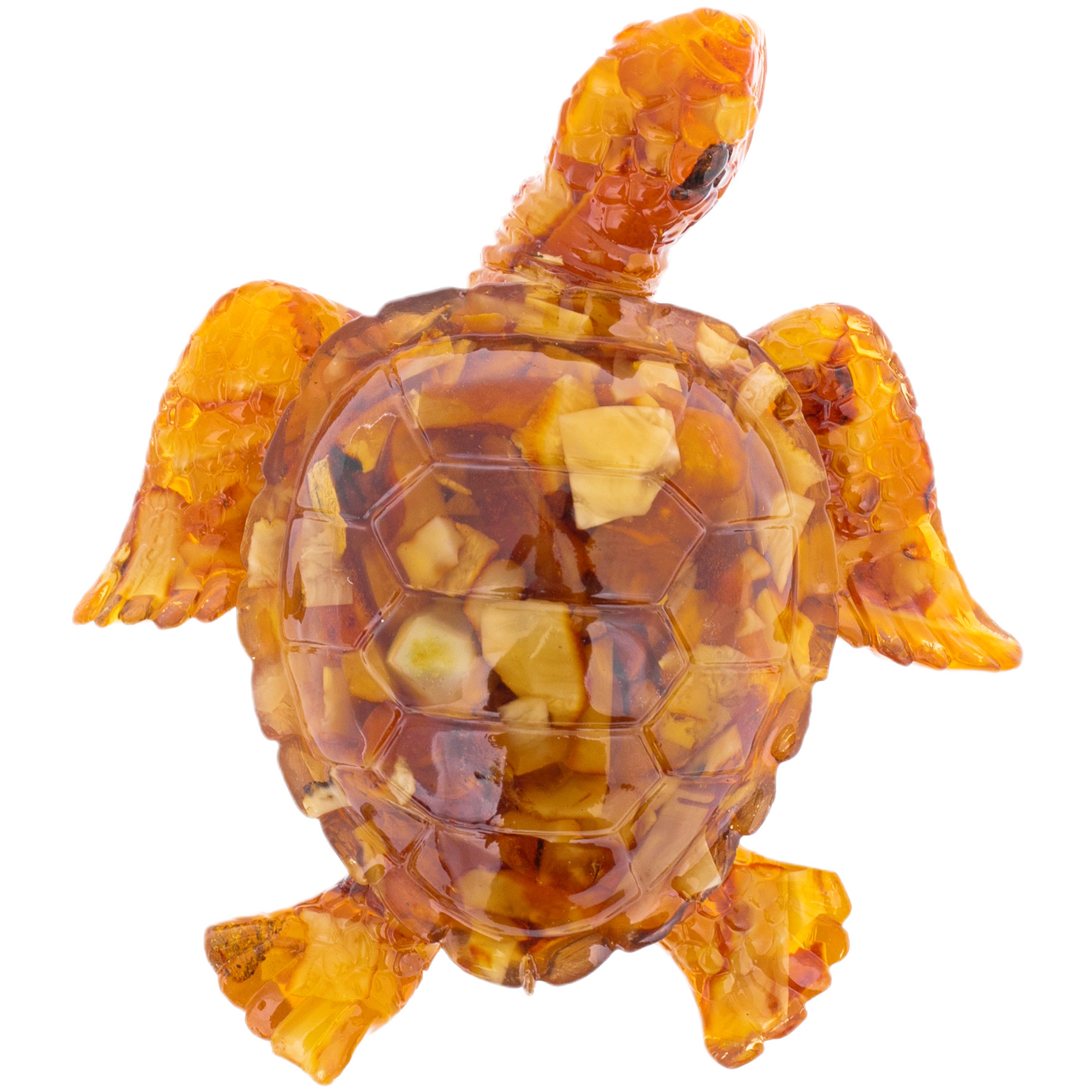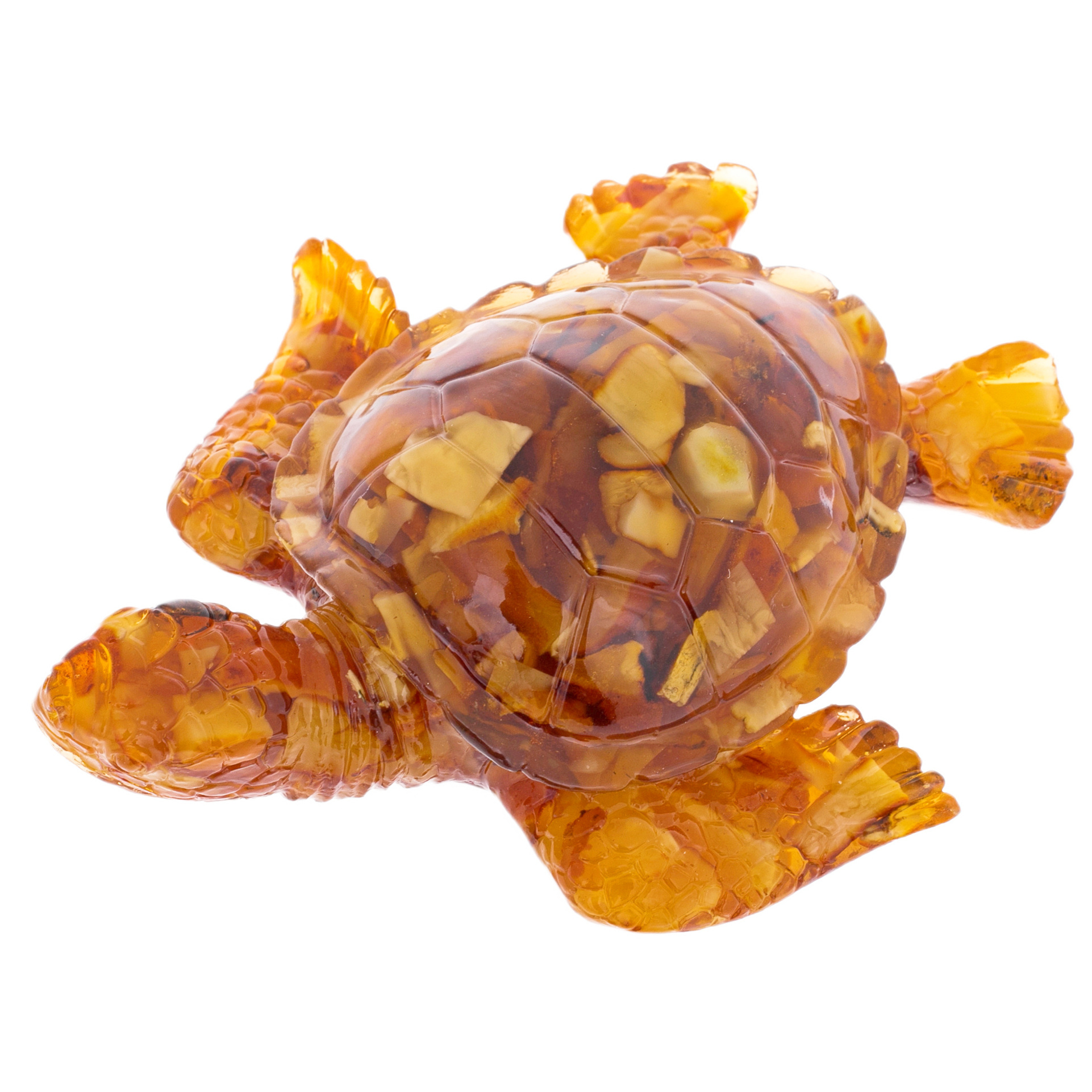 Статуэтка черепахи, выполненная из натурального янтаря, — символ спокойствия, стабильности и долголетия, выраженный в материале, родившемся из древнего света. Благодаря филигранной проработке, фигура передаёт естественные движения морской черепахи — мягко вытянутые ласты, приподнятая голова, уверенный, будто неторопливый шаг. Прозрачная поверхность панциря открывает внутренний мир янтаря: его тёплые переливы, фрагменты окаменевших смол, золотистые искры, будто заключённые в каплю времени.