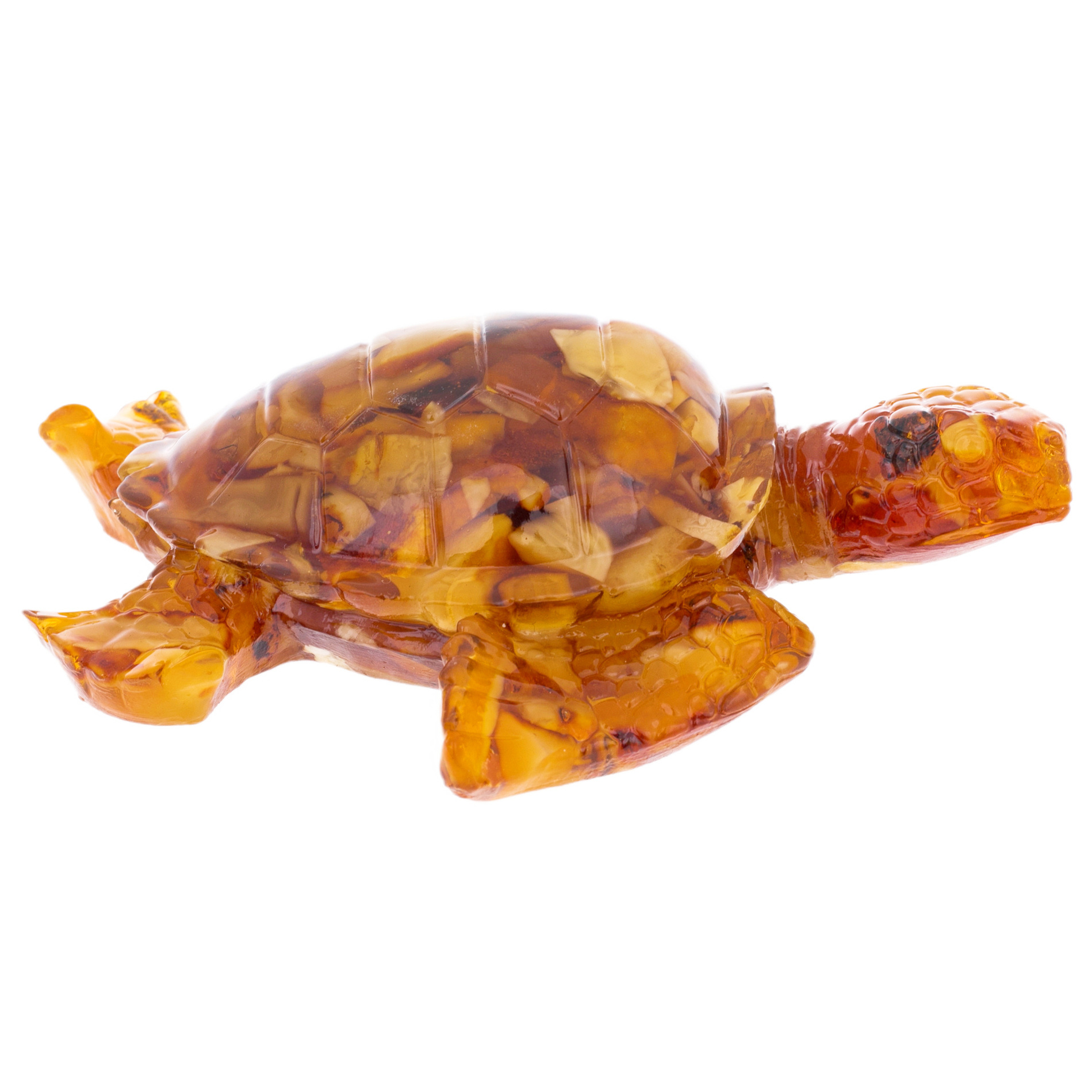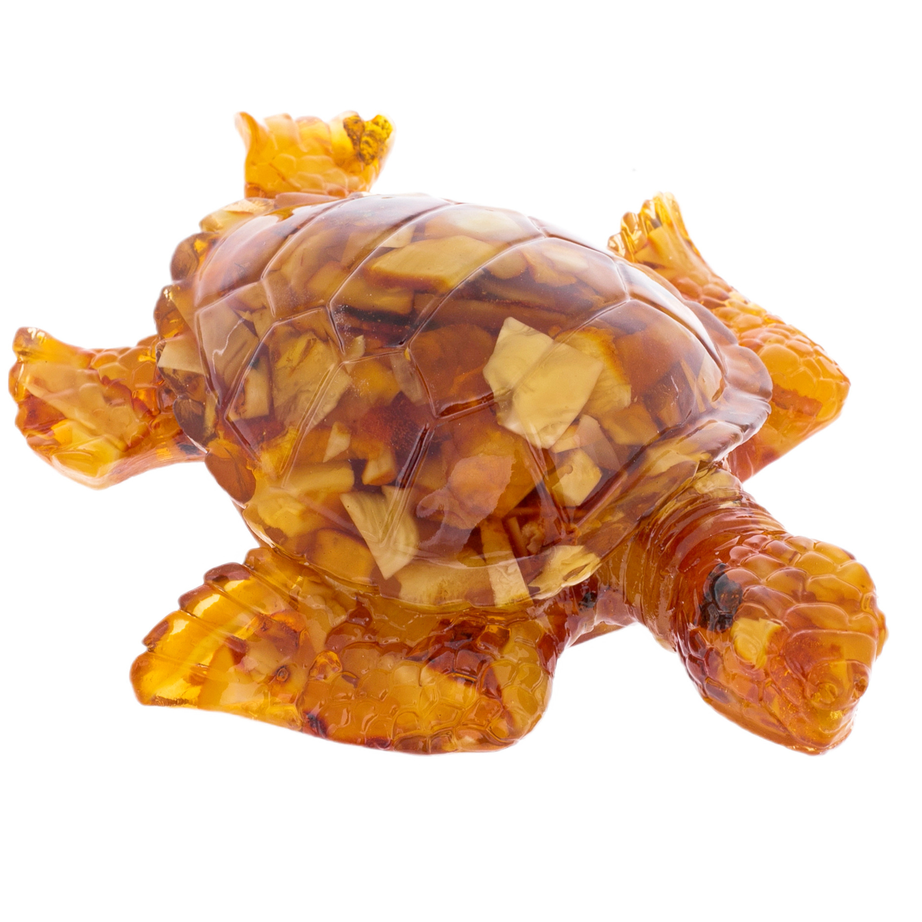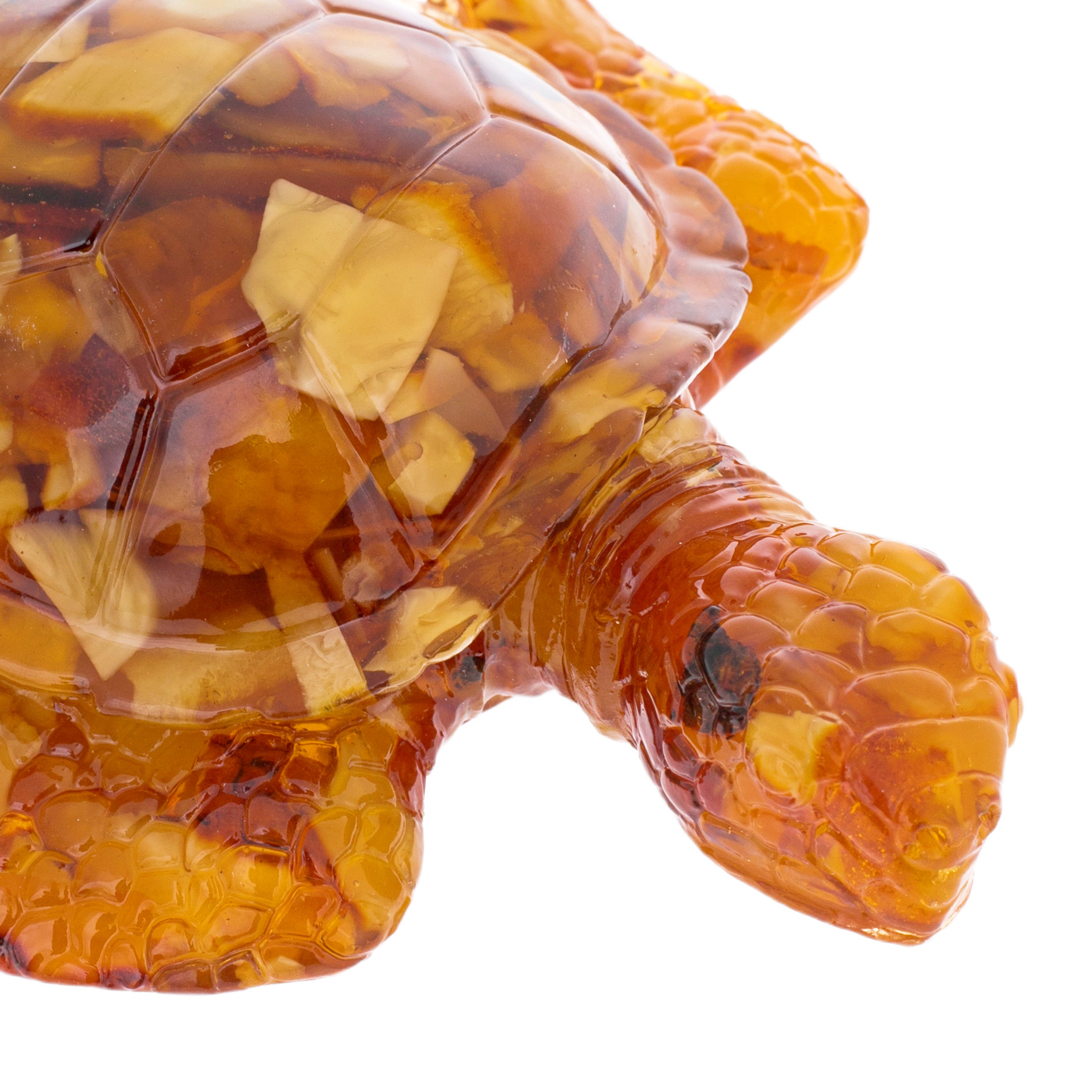 Статуэтка черепахи, выполненная из натурального янтаря, — символ спокойствия, стабильности и долголетия, выраженный в материале, родившемся из древнего света. Благодаря филигранной проработке, фигура передаёт естественные движения морской черепахи — мягко вытянутые ласты, приподнятая голова, уверенный, будто неторопливый шаг. Прозрачная поверхность панциря открывает внутренний мир янтаря: его тёплые переливы, фрагменты окаменевших смол, золотистые искры, будто заключённые в каплю времени.