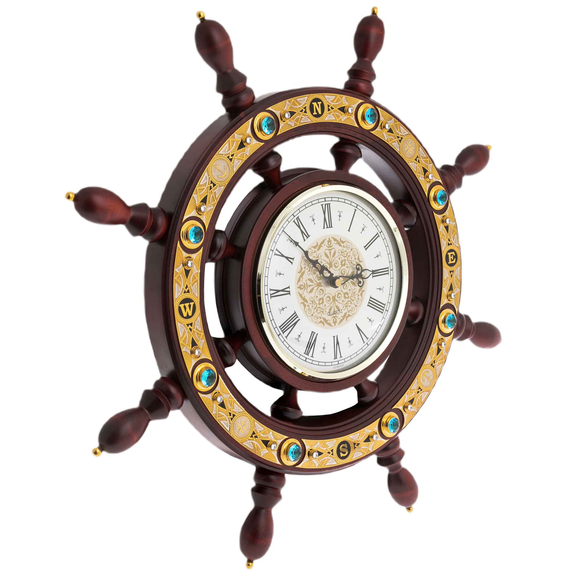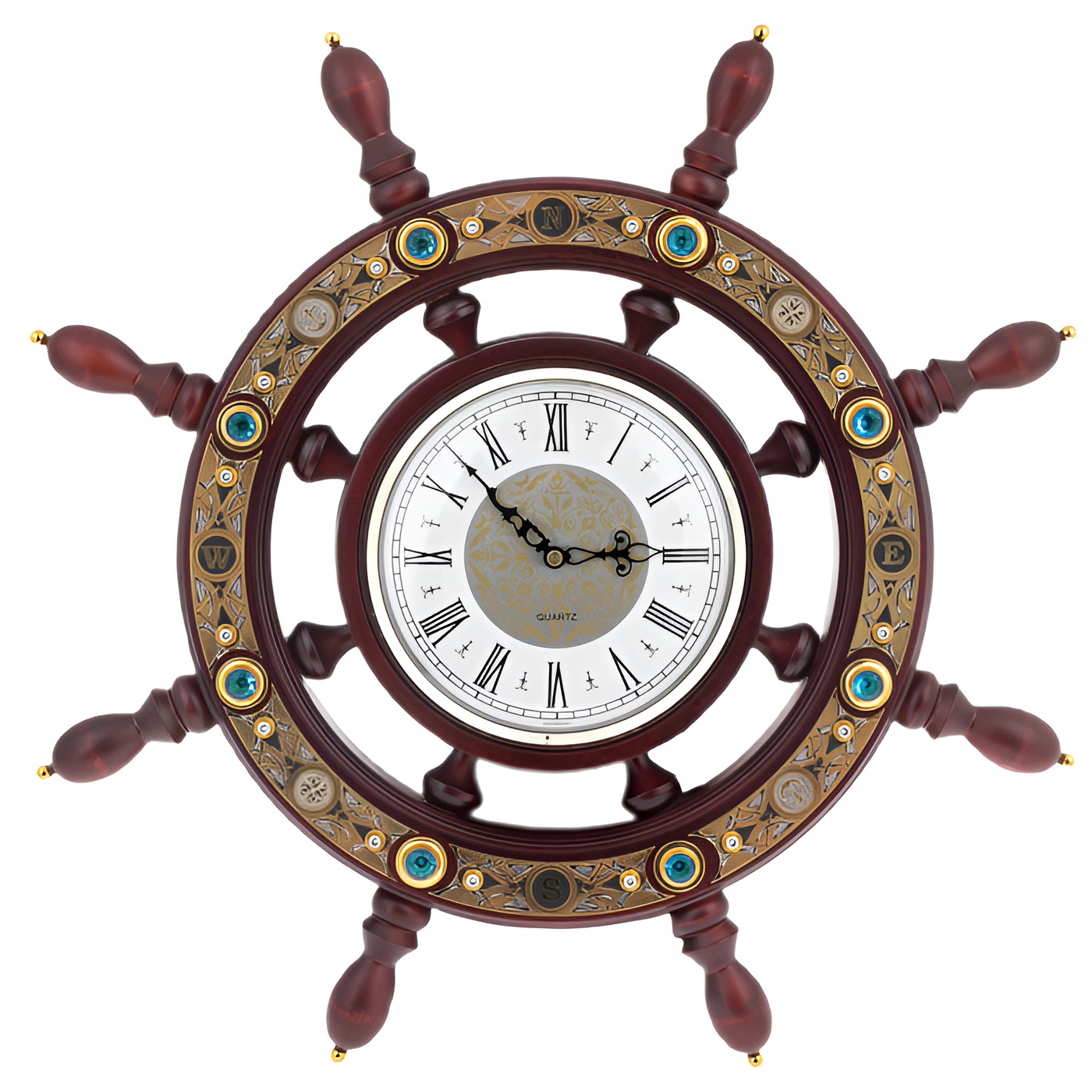 Массивный корпус из благородного дерева, отливающего глубоким красноватым оттенком, словно палуба старинного парусника, покорившего океанские просторы. Золотая инкрустация с тончайшей гравировкой, созданная мастерами Златоуста, добавляет величественности и изысканности, превращая часы в настоящий арт-объект. Каждая из восьми спиц штурвала увенчана миниатюрными вставками, сияющими, словно лунный свет на водной глади. Бирюзовые кабошоны напоминают о морской глубине, драгоценной тайне, скрытой в бесконечности горизонта.