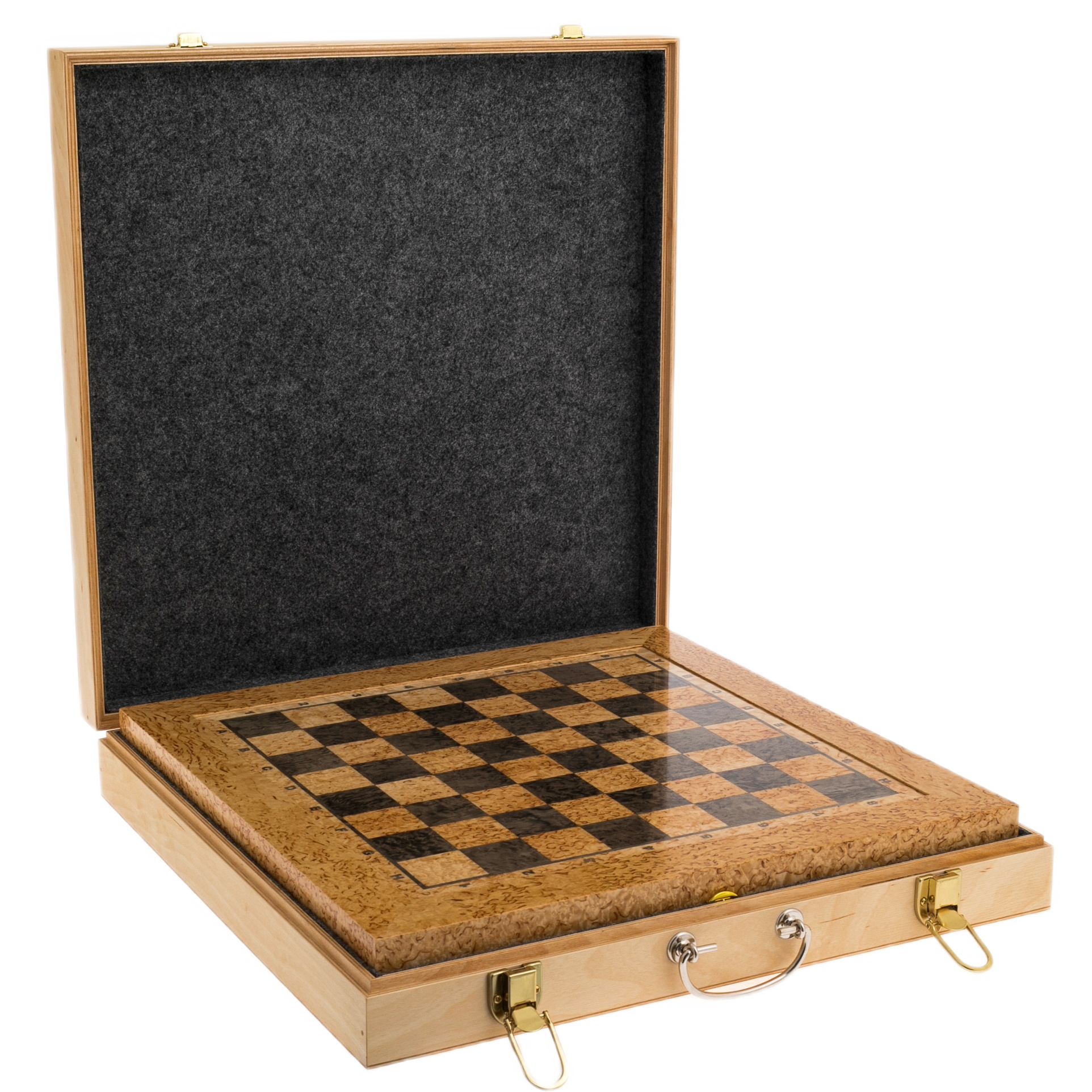 Корпус шахматного ларца изготовлен из той же ценной древесины, что придаёт изделию целостность и статусность. Внутреннее пространство аккуратно организовано для хранения фигур, каждая из которых надёжно фиксируется в отдельном отсеке с мягкой подкладкой, защищающей от повреждений. Надёжные металлические петли и замок обеспечивают сохранность комплекта и удобство использования, а элегантный дизайн делает этот набор достойным украшением любого интерьера.