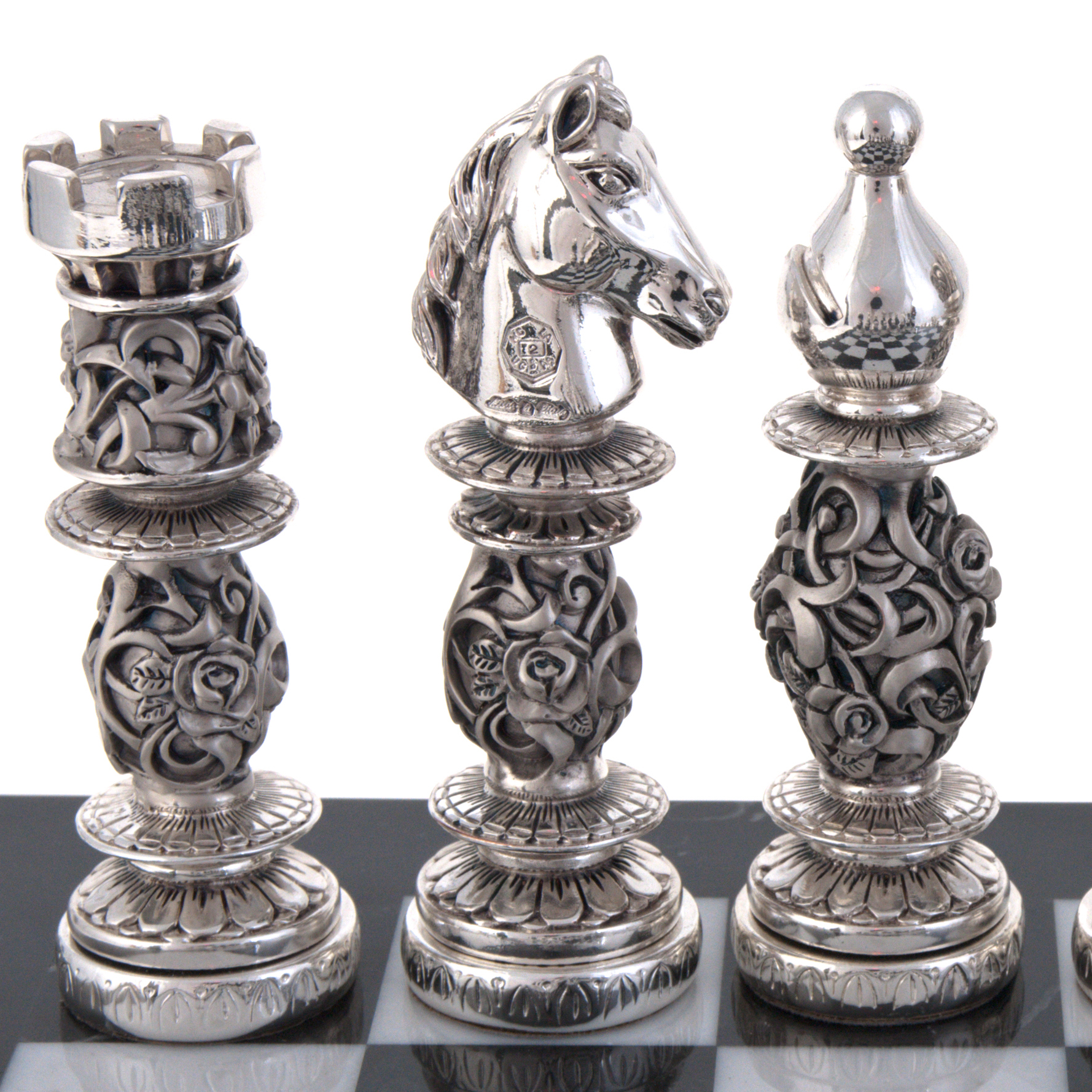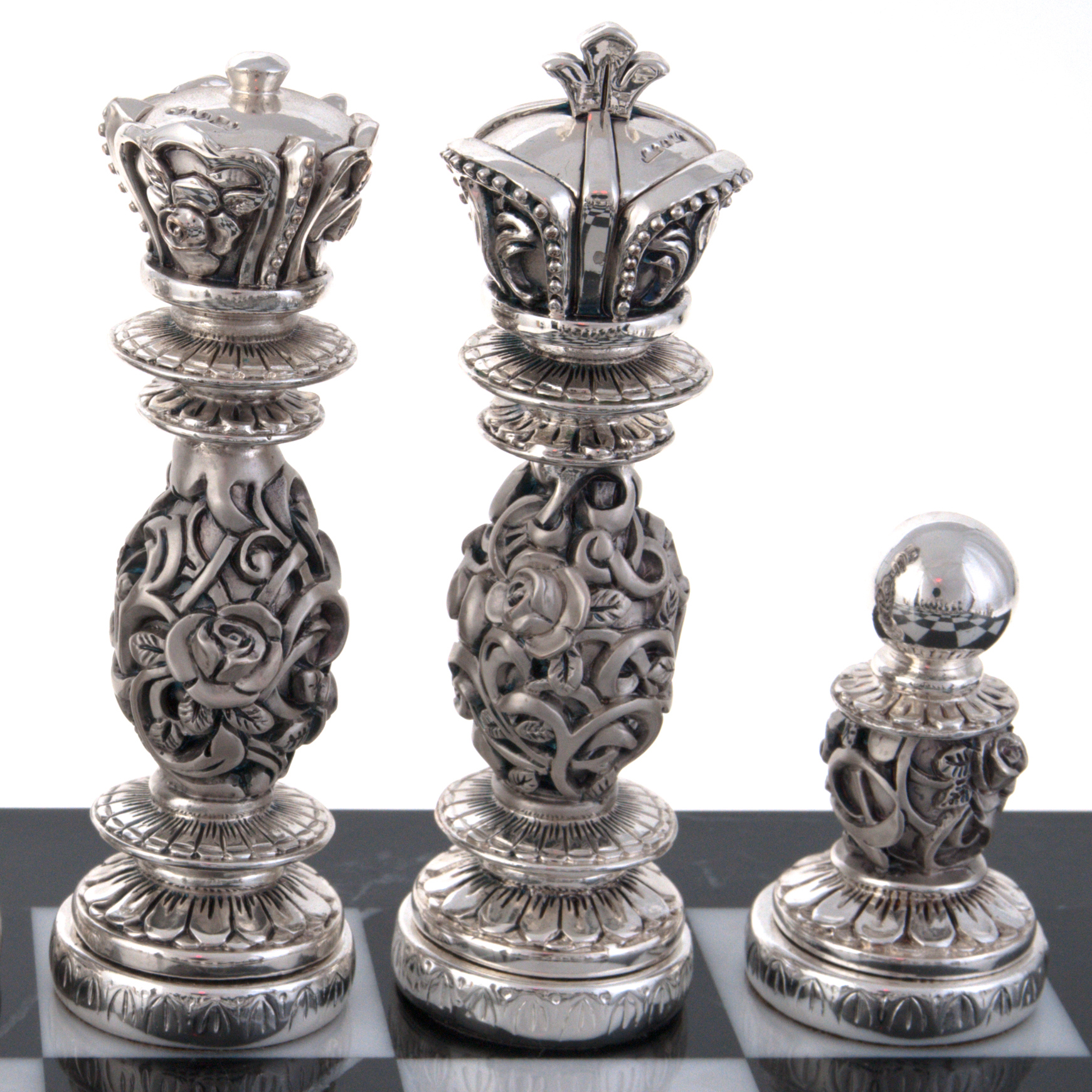 Шахматный набор с чернением "Барокко" — исключительный предмет коллекционного уровня, сочетающий в себе монументальность форм, благородство материалов и символику интеллектуальной власти. Каждая фигура здесь — не просто игровая единица, а малый скульптурный шедевр: воинственные кони, геральдические ладьи, величественные ферзи и короли отлиты с предельной детализацией и украшены изысканным чернением, подчеркивающим рельеф и историческую стилистику образов. Матовая патина и холодный блеск металла создают выразительный контраст, усиливающий ощущение силы и достоинства каждой фигуры.