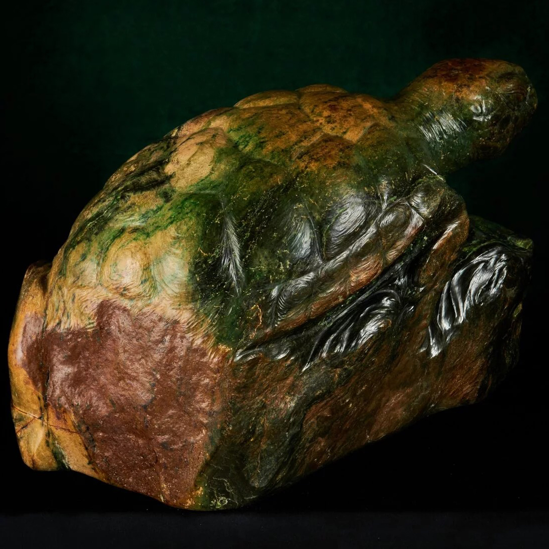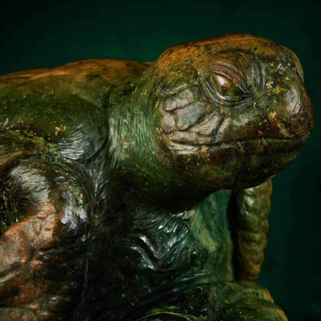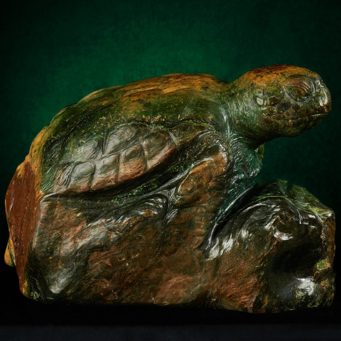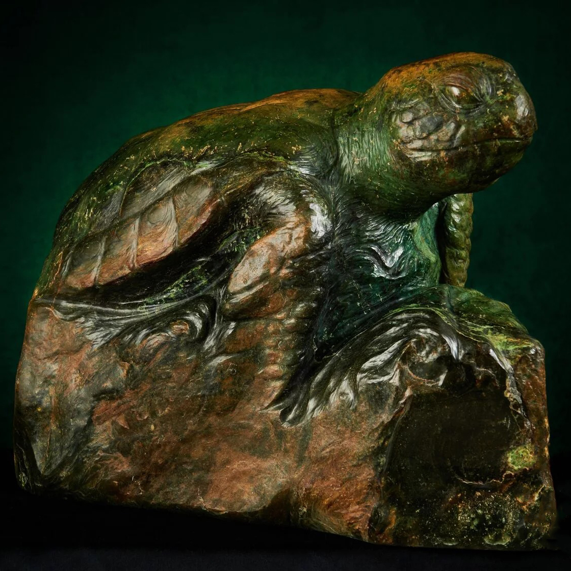 Её фигура, выточенная из речного окатыша нефрита Восточных Саян, олицетворяет мудрость, накопленную веками, суровость стихий и внутреннее равновесие. Зелёные и золотистые оттенки камня словно перетекают друг в друга, отражая движение воды, мягкие всплески волн и солнечные блики, которые пронзают поверхность океана. Каждая линия панциря дышит силой и историей, напоминая о нерушимости и стойкости перед лицом времени.