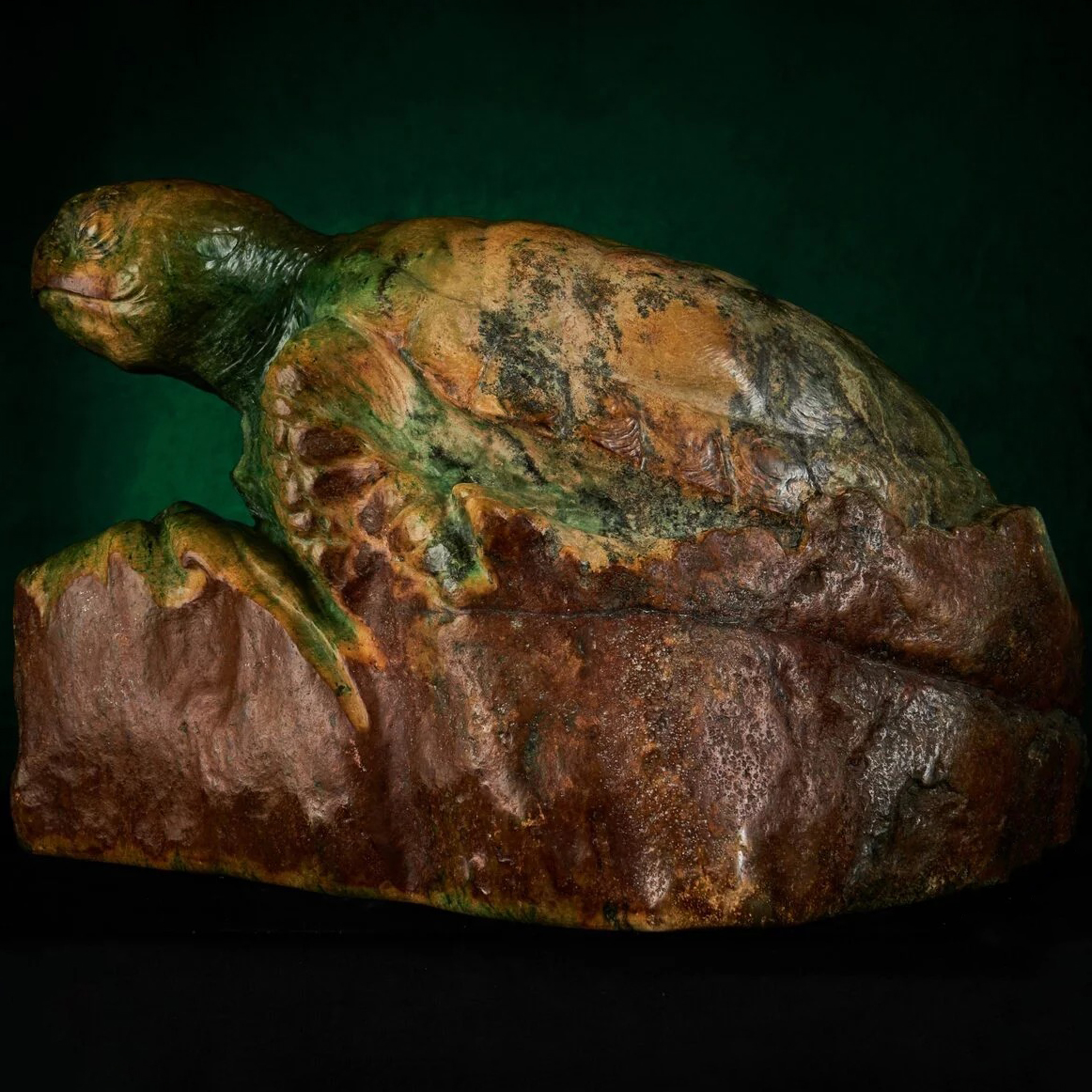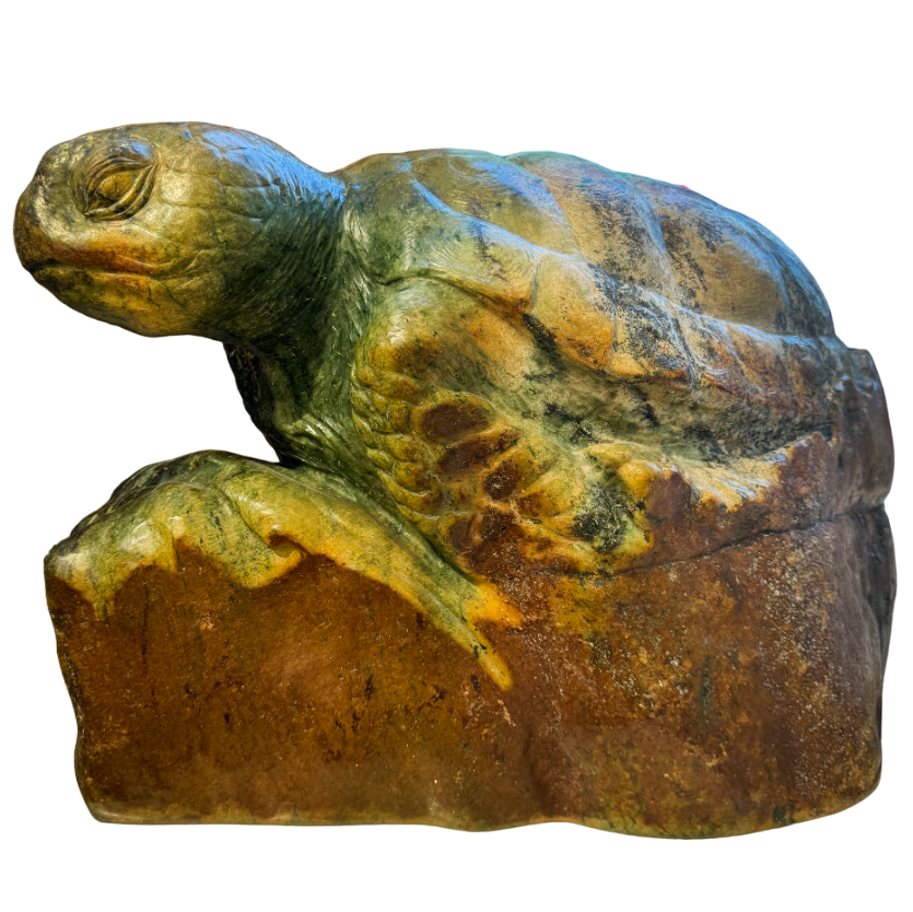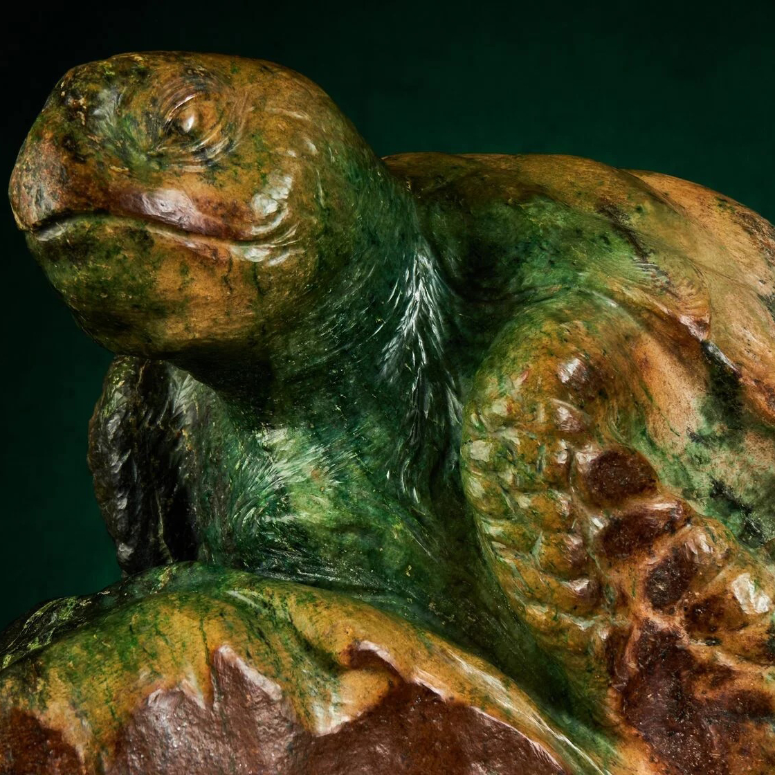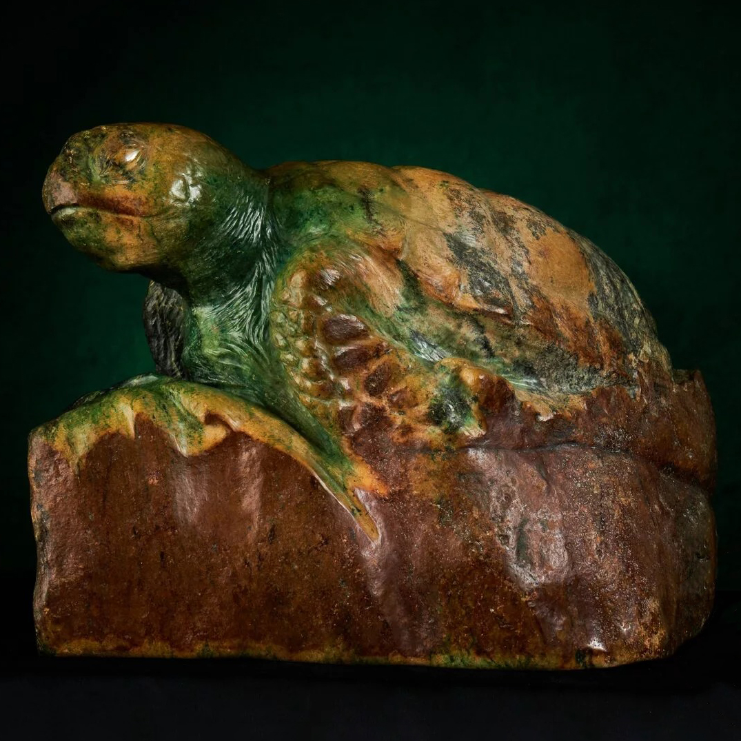 Авторская скульптура из нефрита «Морская черепаха» — это воплощение вечности, силы и природной мудрости, скрывающейся в глубинах первозданного океана. Каждая черта этого произведения искусства — от текстуры панциря до мягких изгибов плавников — передаёт дух древних водных миров, где течёт жизнь в её первозданной гармонии. Нефрит, использованный мастером, обладает не только изысканным блеском, но и магической глубиной, создавая ощущение, будто черепаха действительно выплывает из мрака океанских глубин.