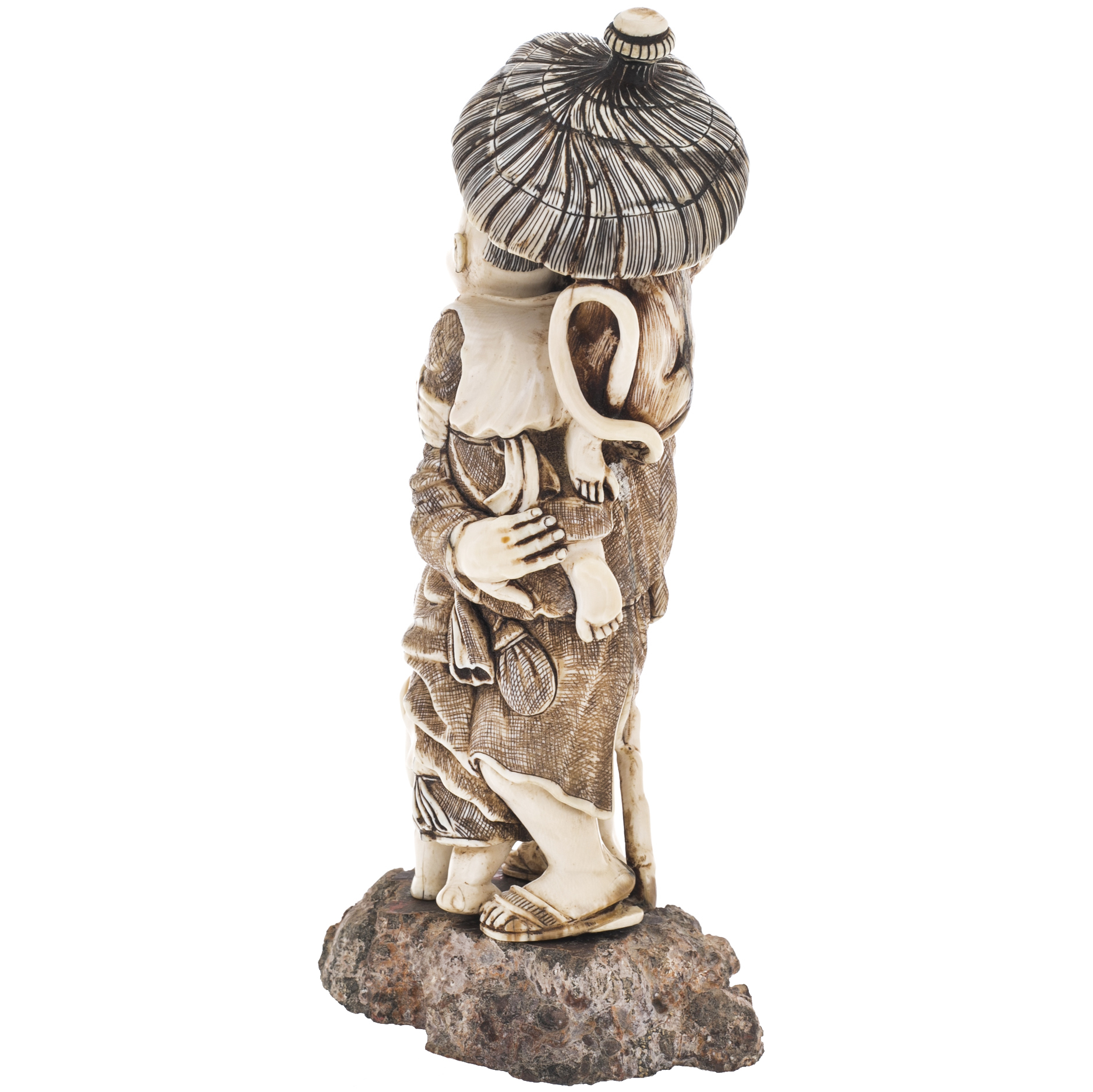 Прекрасный сувенир "Семья с обезьянкой под зонтом", изготовленный из бивня мамонта, является выдающимся произведением искусства, передающим очарование и юмор семейных уз. На изделии изображена сцена из семейной жизни: взрослый отец под зонтом, держащий на плечах маленького сына и обезьянку, в то время как младшая дочь играет у их ног. Использование бивня мамонта добавляет уникальности экземпляру, делая его настоящим раритетом.