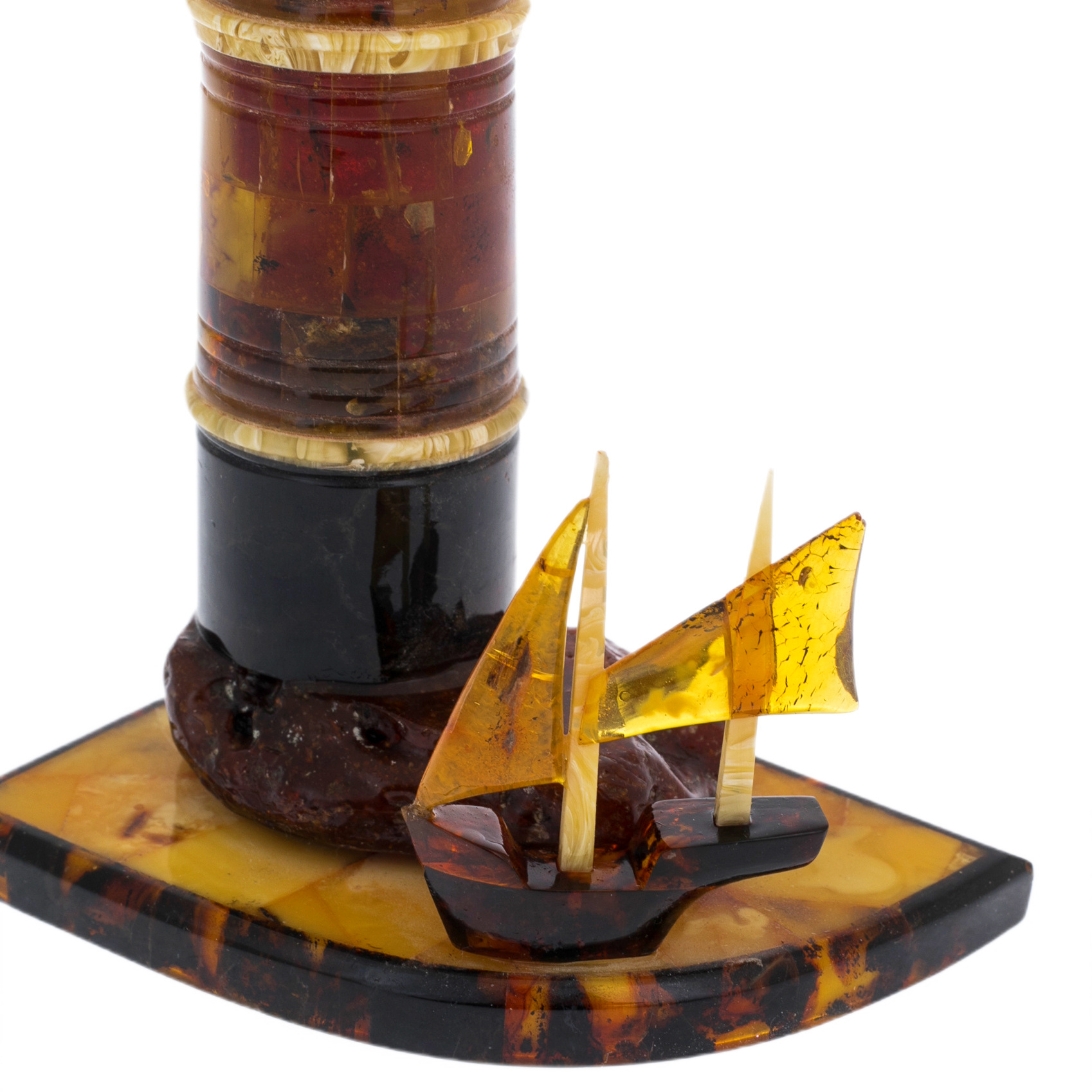 Скульптурная композиция пронизана духом романтики морских путешествий. В основании маяка раскинулся янтарный берег, а у его подножия застыло в вечном плавании крошечное парусное судно, словно только что вышедшее из древних хроник. Его паруса высечены из прозрачного солнечного янтаря, будто напитанного светом далёких горизонтов. Каждая деталь, от мельчайших оконных проемов до утонченного шпиля, дышит искусством старых мастеров, вложивших в янтарь историю мореплавания, надежду странников и дух первооткрывателей.