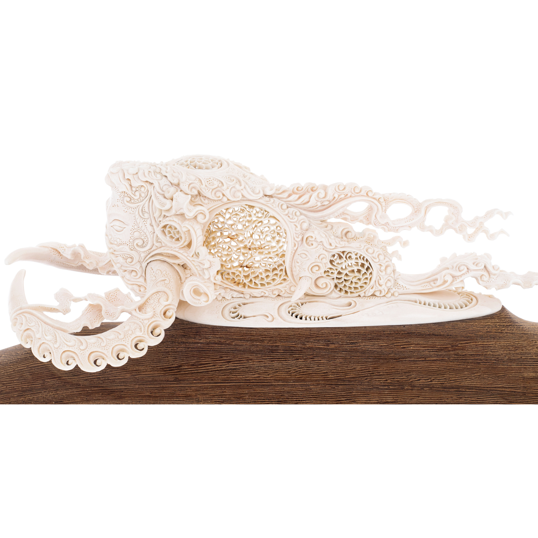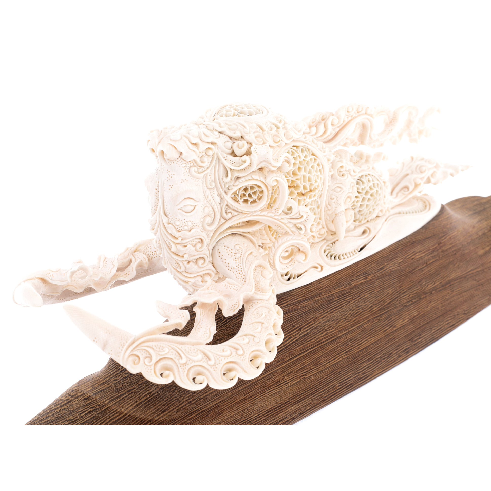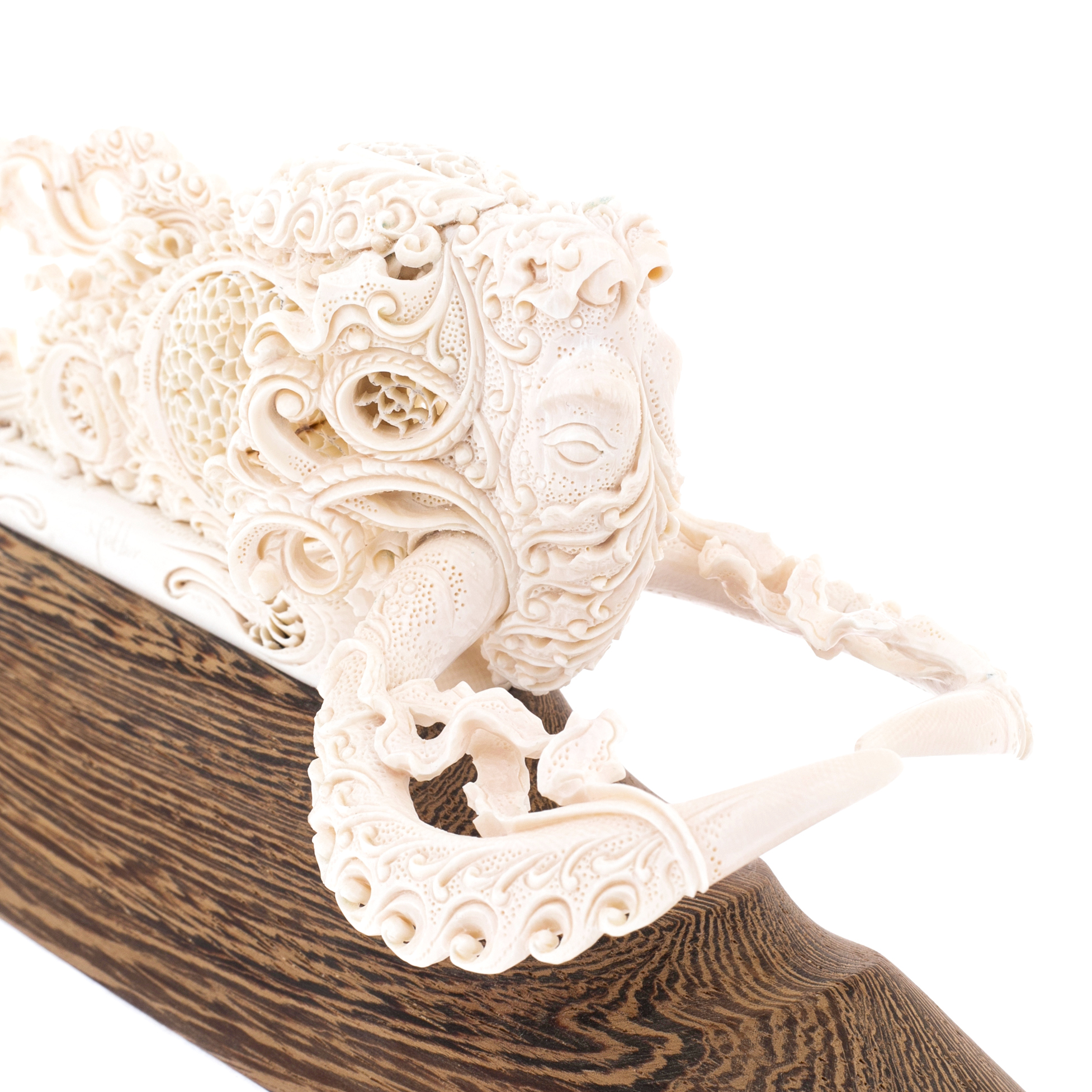 Эта скульптура — не просто образ мамонта, а метафора пути. Изгибы и узоры, сплетающиеся в ажурные кружева, словно потоки ветра, несущие древнего властителя льдов сквозь века. Его рога устремлены вперед, прорезая неведомые горизонты, а в каждом завитке резьбы скрыта философия движения: неотвратимого, неоспоримого, как сама природа. Подставка из благородного дерева — символ прочности и вечности, устойчивый фундамент, на котором зиждется само понятие наследия.
