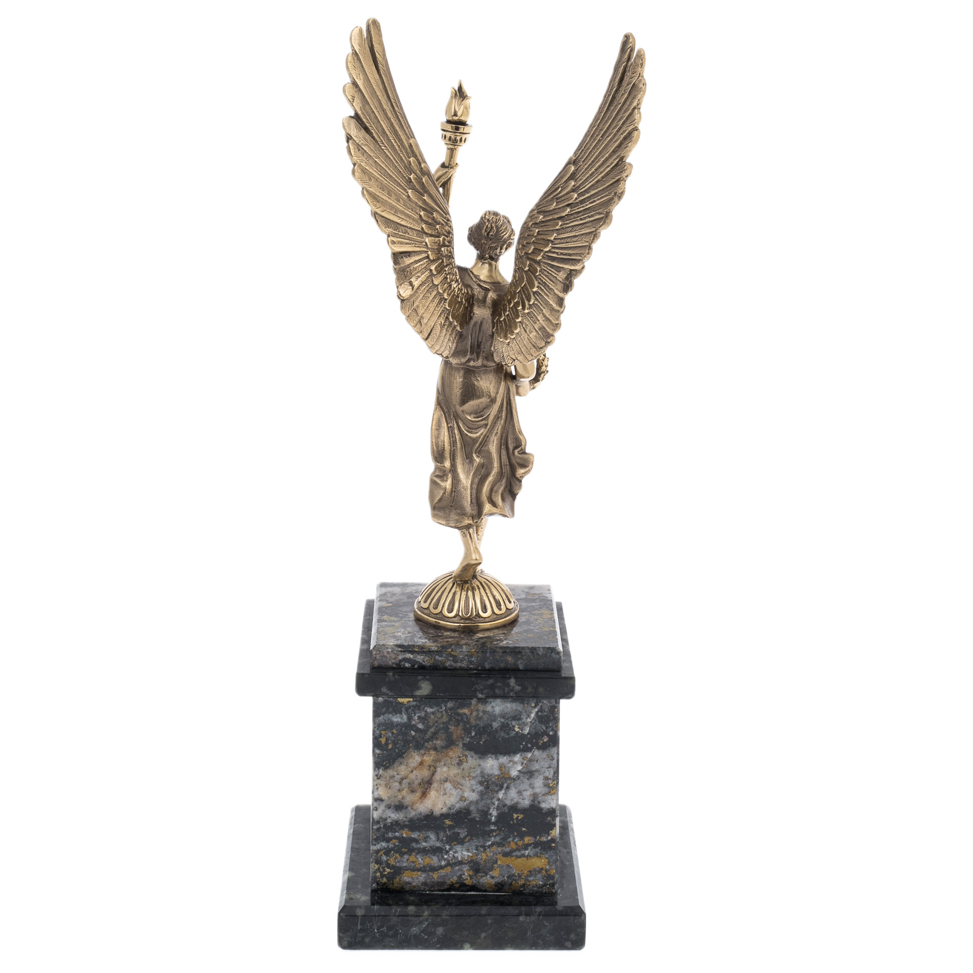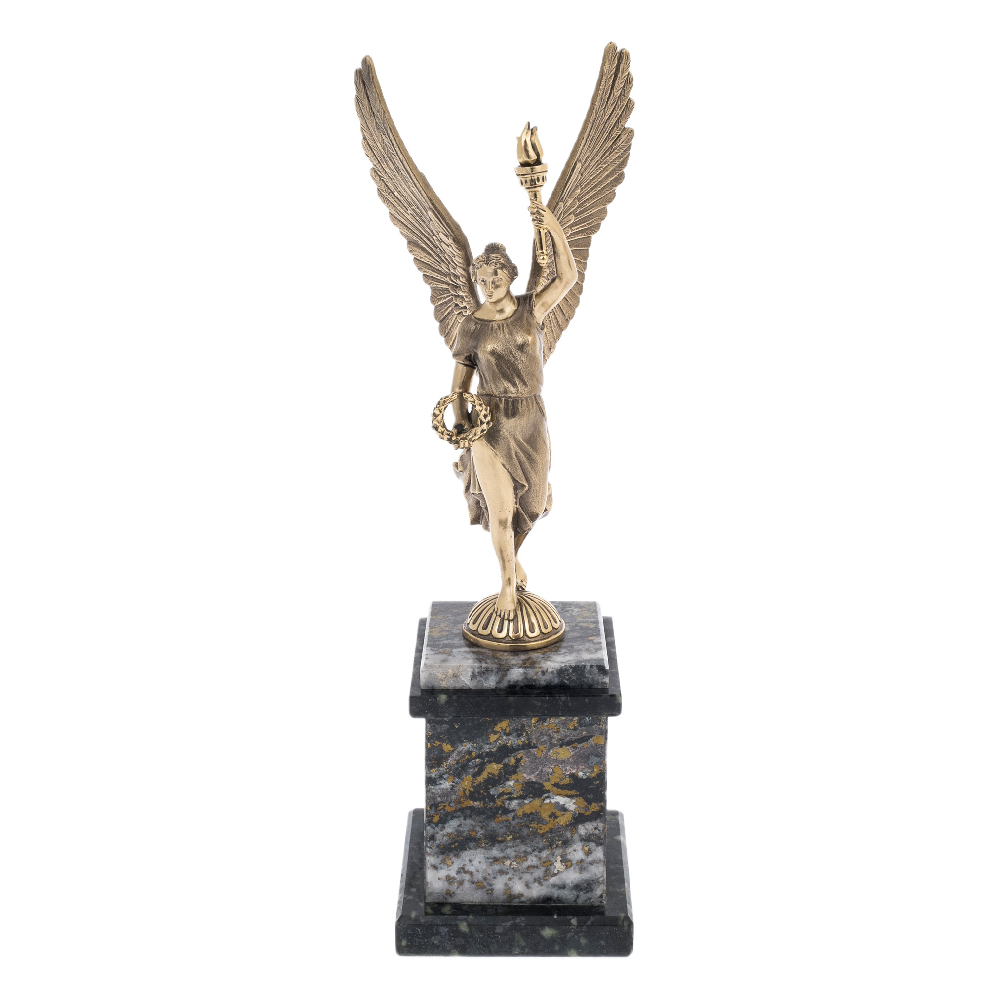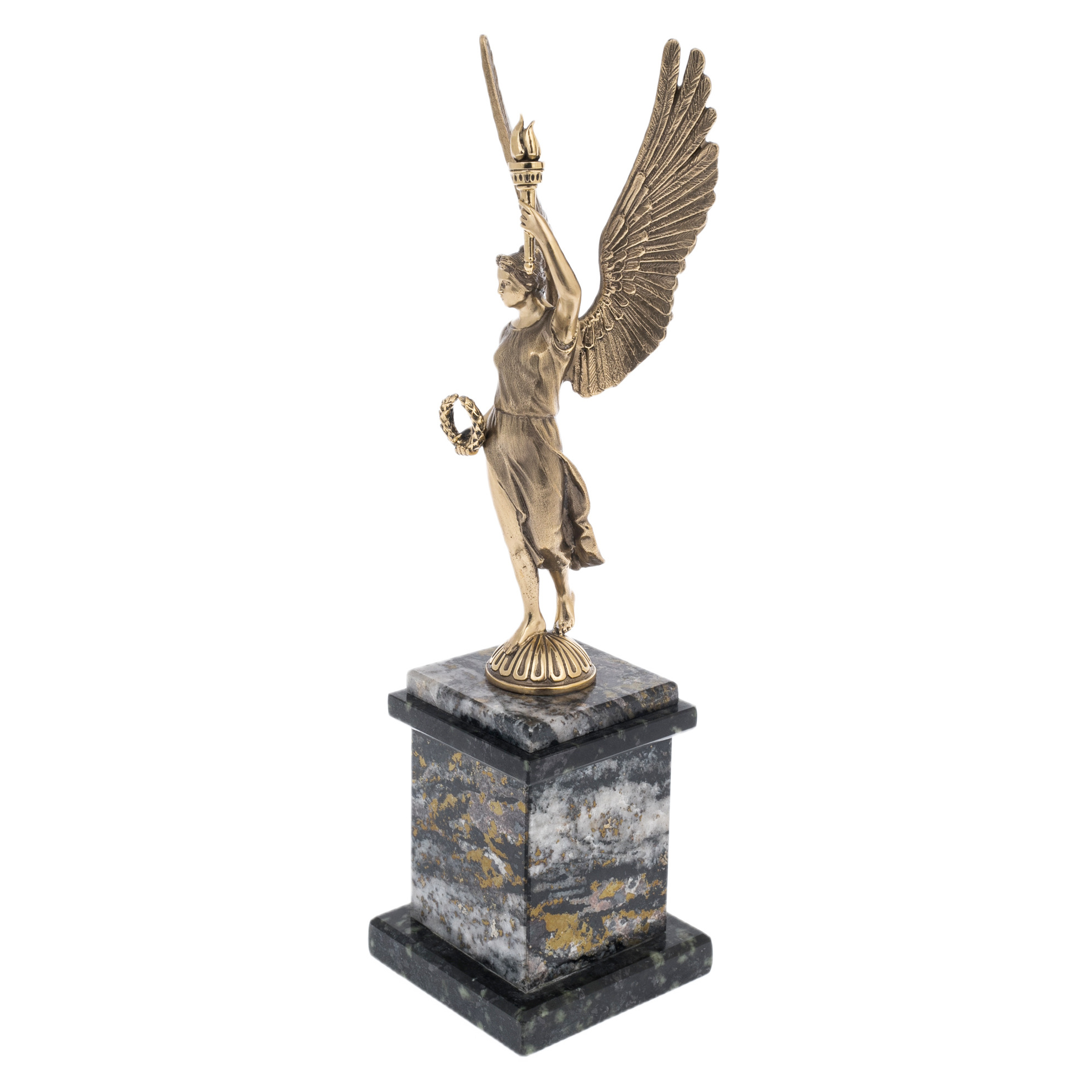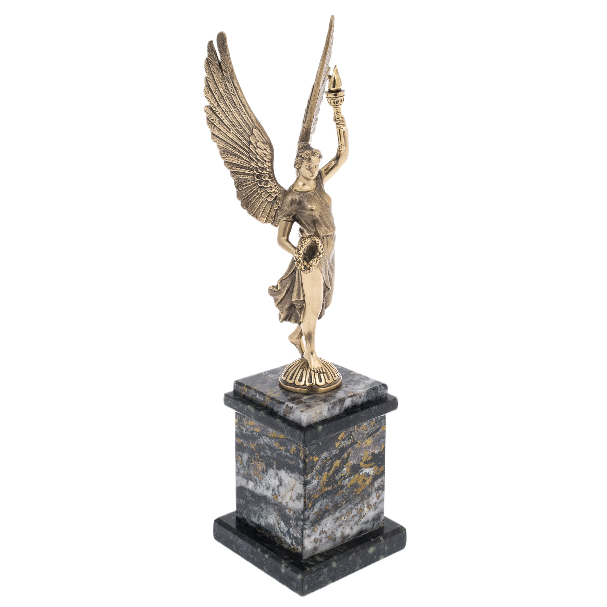 Статуэтка из бронзы "Ника — Богиня Победы" — воплощение силы, триумфа и вечного вдохновения. Фигура богини с распахнутыми крыльями, держащей в руках лавровый венок и факел, выполнена с изысканной детализацией и тонким художественным чувством. Монументальная композиция стоит на массивном постаменте из натурального камня с золотистыми вкраплениями, создавая гармоничный контраст между благородной бронзой и текстурой мрамора. Эта скульптура адресована истинным ценителям классического искусства, для которых символика победы и силы является источником вдохновения и мотивации.