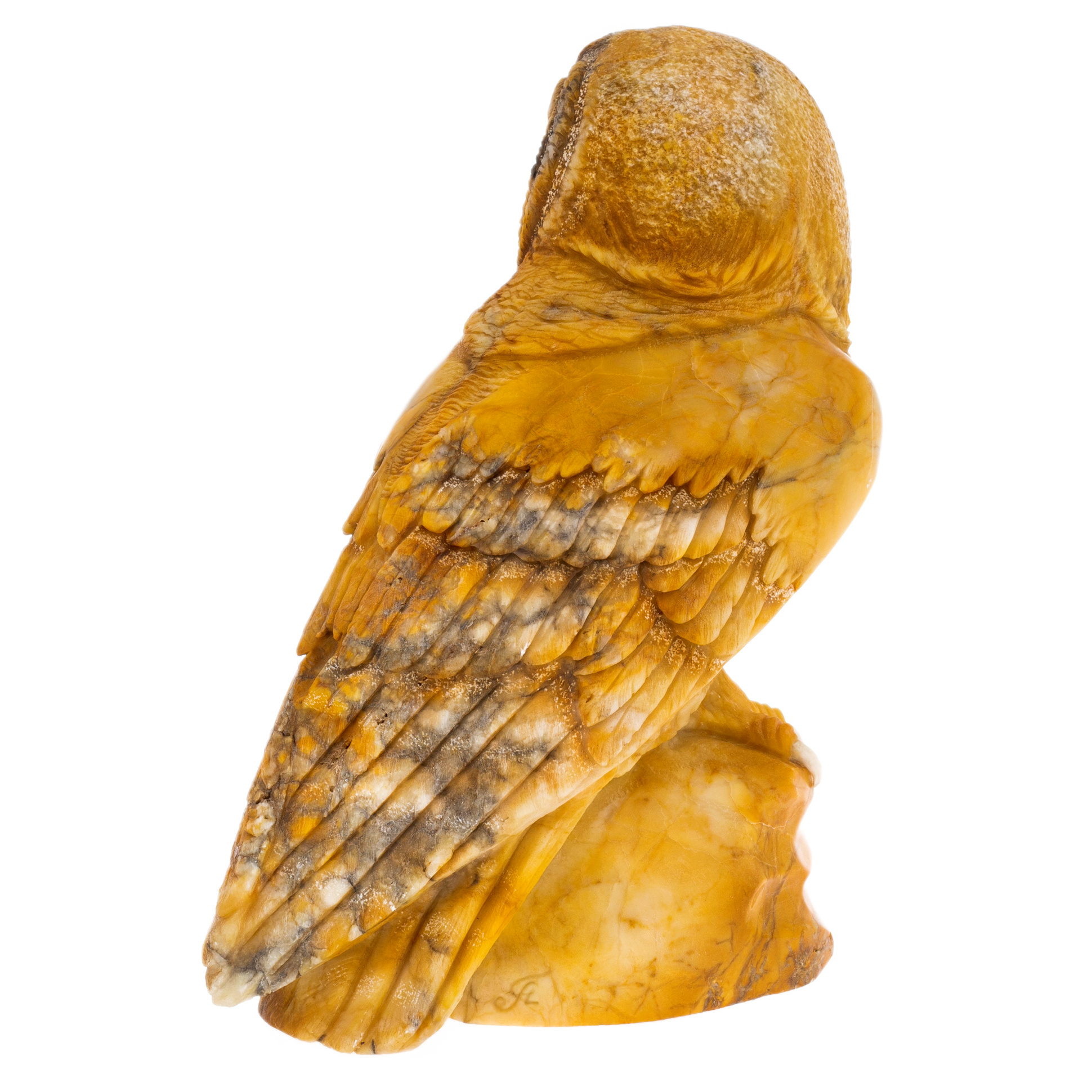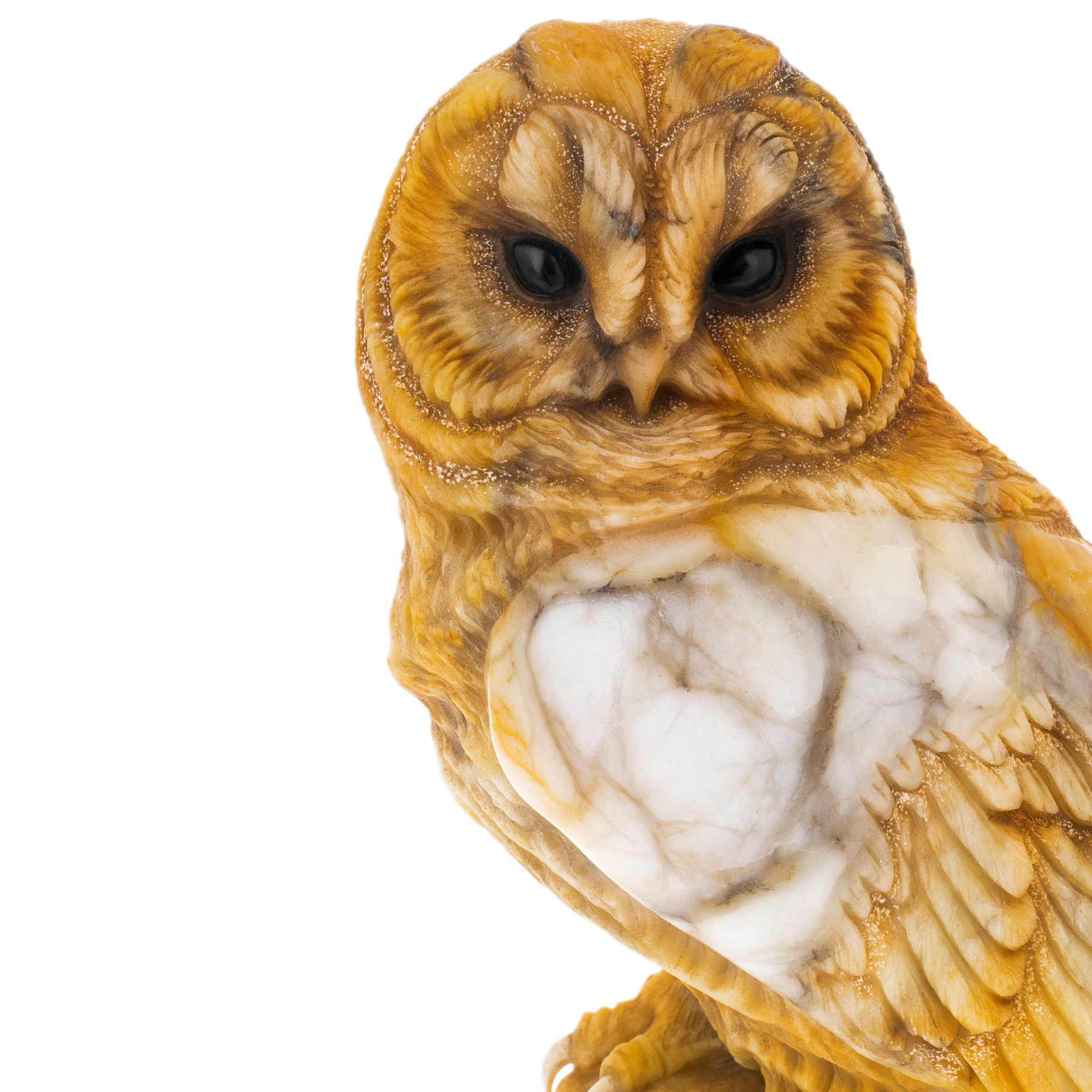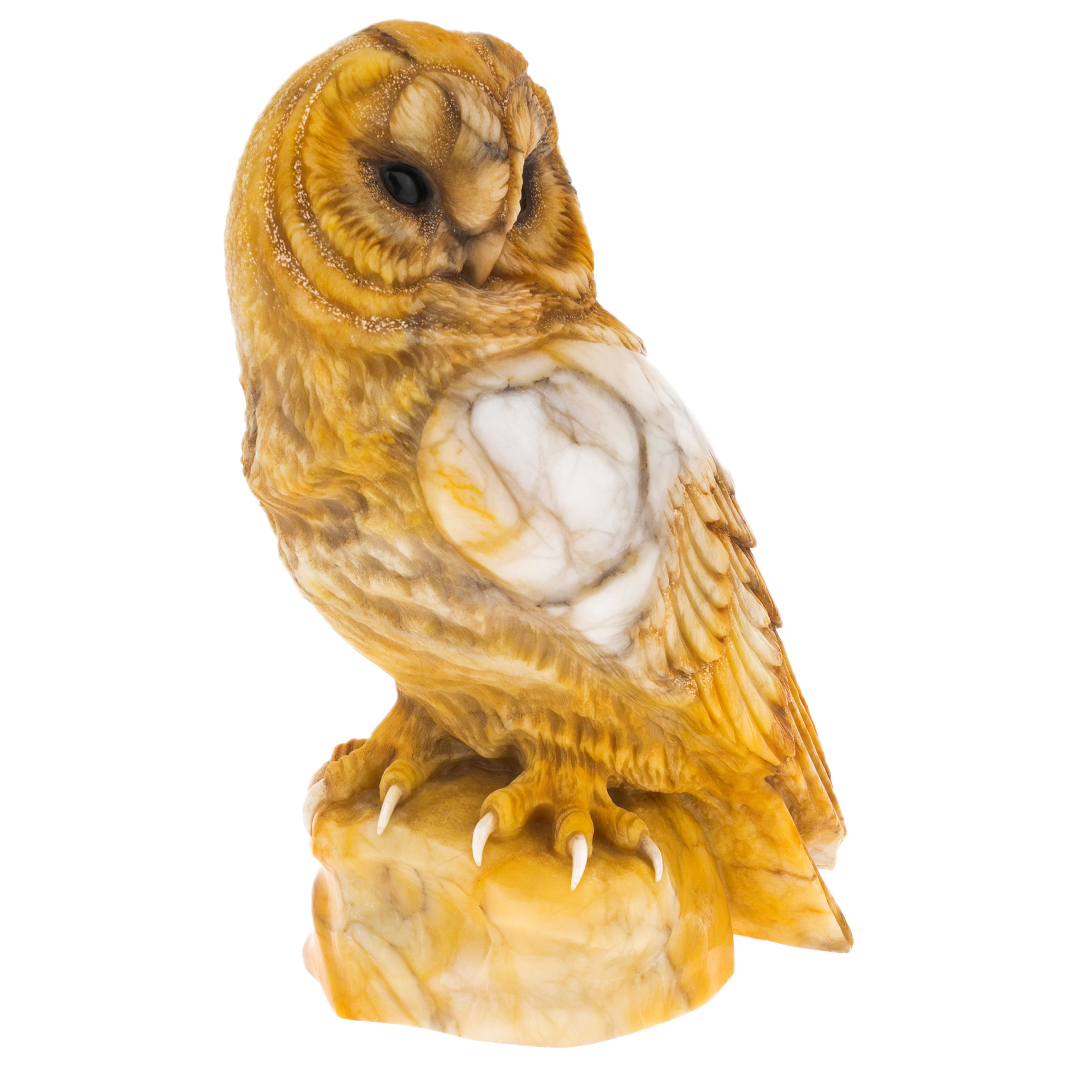 Величественная текстура ангидрита, из которого выполнена скульптура, переливается золотыми оттенками, словно символизируя свет, проникающий сквозь века. Этот камень, известный своей хрупкостью и редкостью, напоминает о ценности знаний, которые требует времени и усилий для постижения. Сова же, сидящая в глубоком созерцании, словно хранительница этих древних тайн, приглашает своего владельца к бесконечному поиску истины.