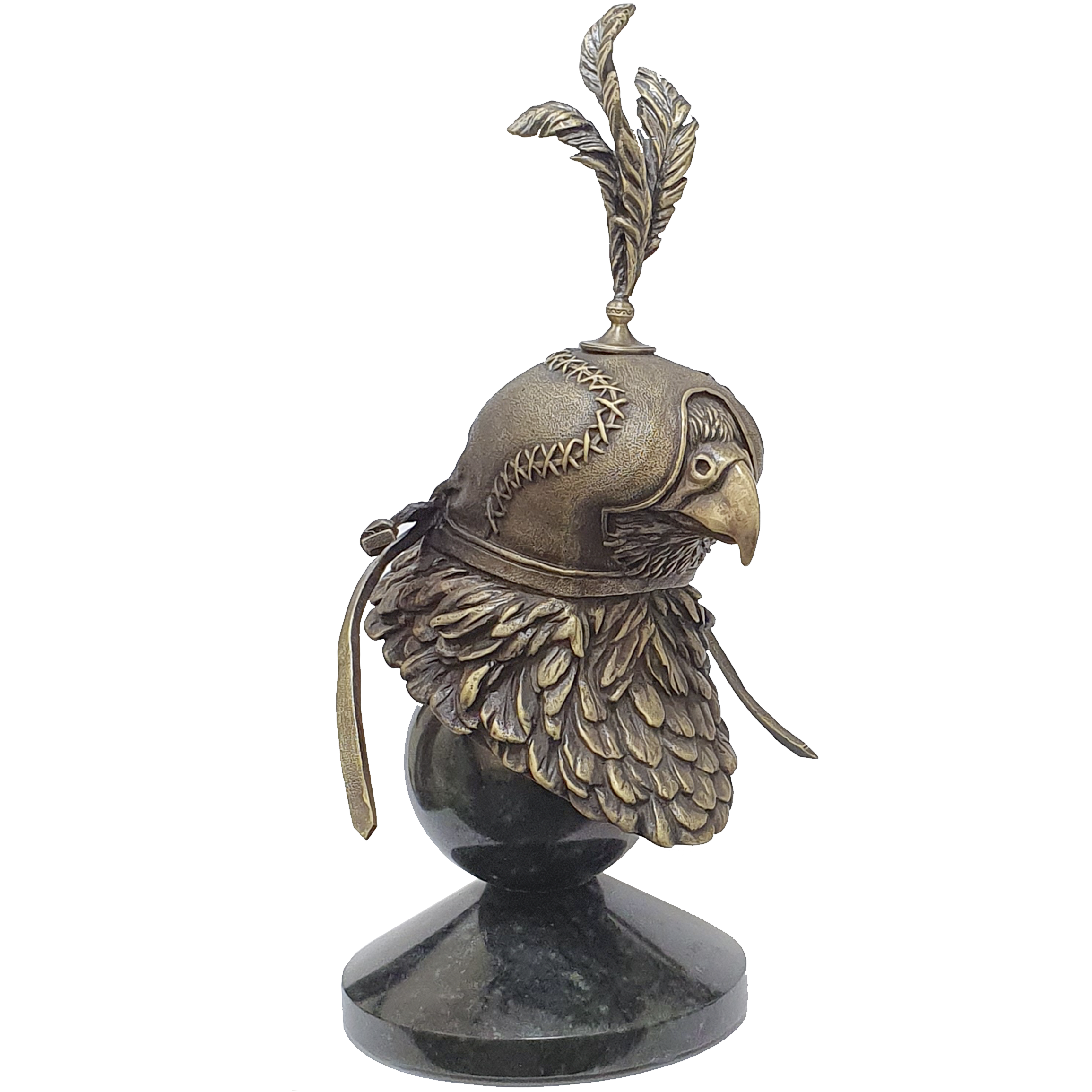 Каждая деталь этой статуэтки — дань мастерству и вниманию к символам. Доспехи на голове сокола, украшенные изысканной вышивкой и грозными перьями, передают образ рыцаря, обладающего не только физической силой, но и благородством. Изогнутый клюв, внимательный взгляд и крылья, покрытые бронзовыми перьями, будто оживают под руками мастера, намекая на готовность к стремительному полёту и решительным действиям.