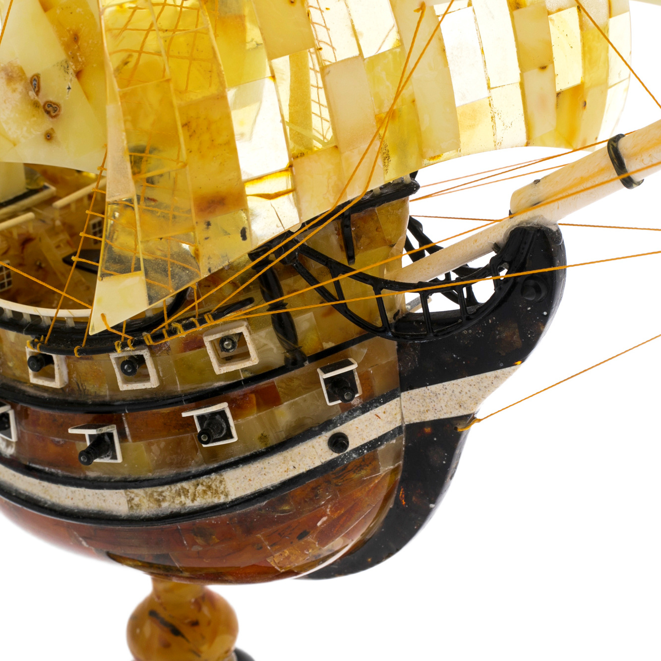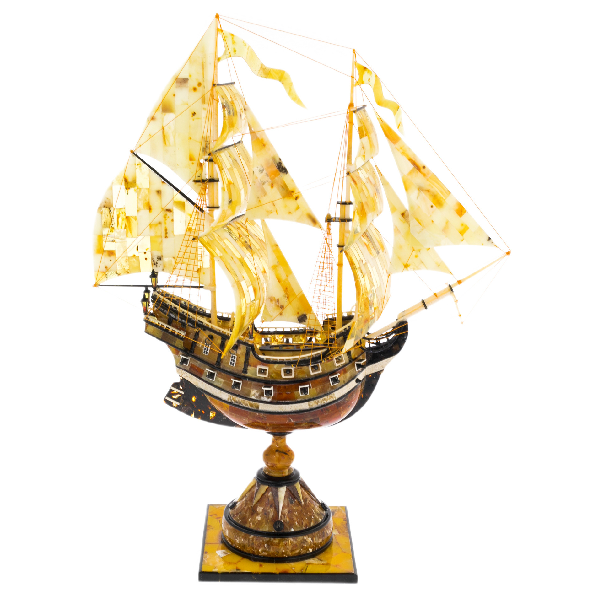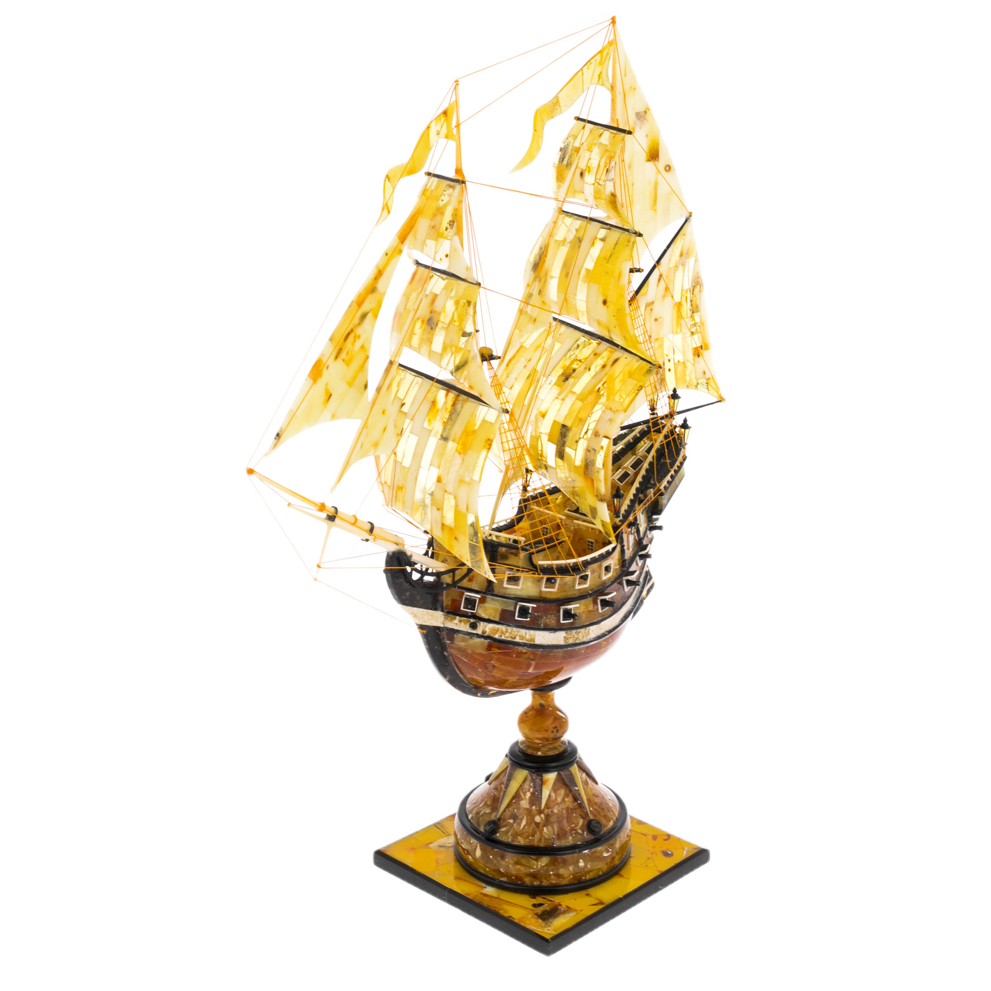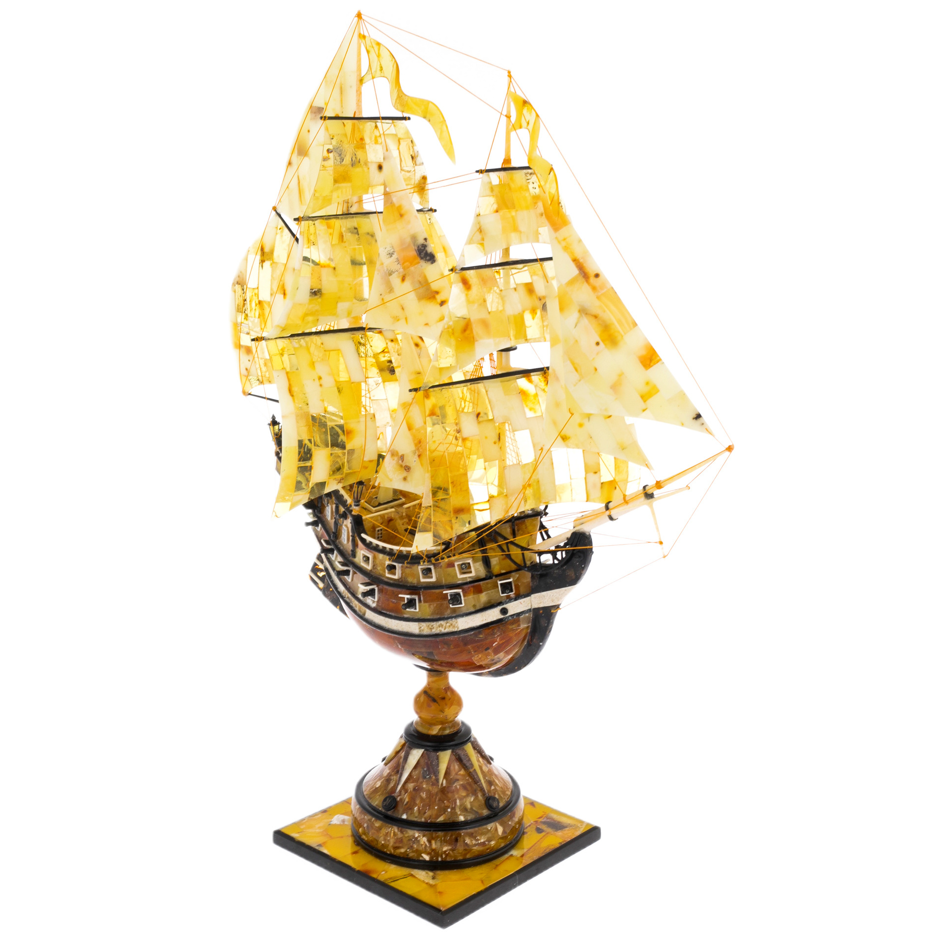 Каждая деталь фрегата выполнена с кропотливой точностью. Тончайшие ниточки рей и рангоутов изящно переплетаются, создавая иллюзию движения, словно ветер наполняет паруса и ведёт судно к новым открытиям. Подставка, выполненная из янтарного мозаичного массива, добавляет устойчивости и завершает композицию. Она как океанская глубина, подчёркивает мощь и величие судна.