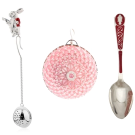 Русские самоцветы Набор подарочный новогодний "Розовый" с шаром, ложечкой и ситечком для чая Набор подарочный новогодний "Розовый" с шаром, ложечкой и ситечком для чая Подарочный новогодний набор «Розовый» представляет собой изящную композицию из трёх предметов, собранных в едином эстетическом ключе. В центре — праздник нежности и света: роскошный рождественский шар, созданный в технике художественной эмали, сияющий оттенками розового жемчуга. Рельефная звезда, раскрывающаяся на его поверхности, вплетена в орнамент из миниатюрных страз, отражающих мягкое свечение, словно крупинки инея на зимнем воздухе. К шару добавлены серебряная ложечка и чайное ситечко, украшенные глубокими алыми эмалями и миниатюрными фигурными деталями, придающими набору характер искреннего, камерного подарка. Ситечко, закреплённое на тонкой цепочке, увенчано фигуркой зайца — персонажем, будто сошедшим со страниц старинной сказки. Ложечка, выполненная в том же художественном ансамбле, несёт эмалевые акценты и тонко прописанный рельеф, будто созданный специально для ритуала неспешного зимнего чаепития. Все элементы набора выполнены из ювелирного металла с тщательной полировкой, подчёркивающей каждую грань декоративной работы.