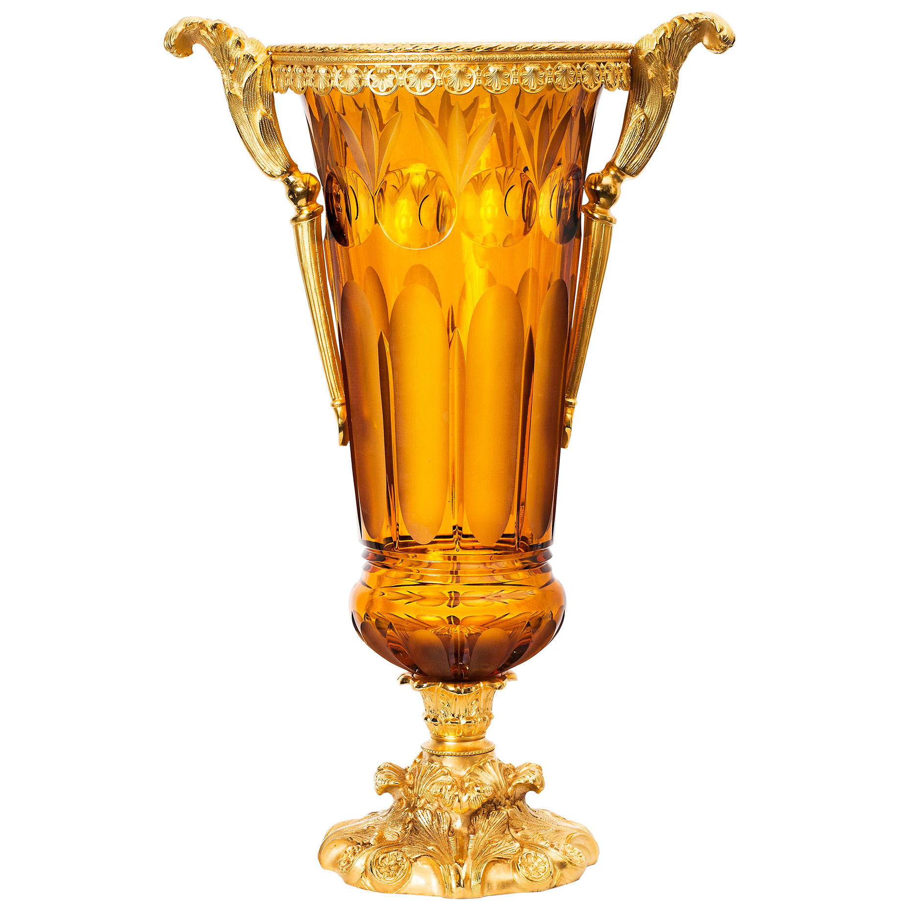 Этот шедевр искусства словно вырван из дворцовых залов Европы, где великие императоры вершили судьбы, а мастера ампира и необарокко создавали вечные символы власти, изящества и роскоши. Высокая форма этой вазы повторяет силуэты триумфальных кубков, которыми венчали победителей в состязаниях богов и людей. Ее янтарный хрусталь — это не просто материал, а застывший свет закатного солнца, плененный в изысканной огранке.
